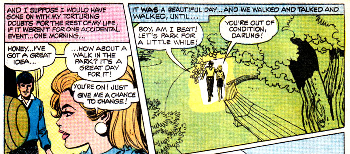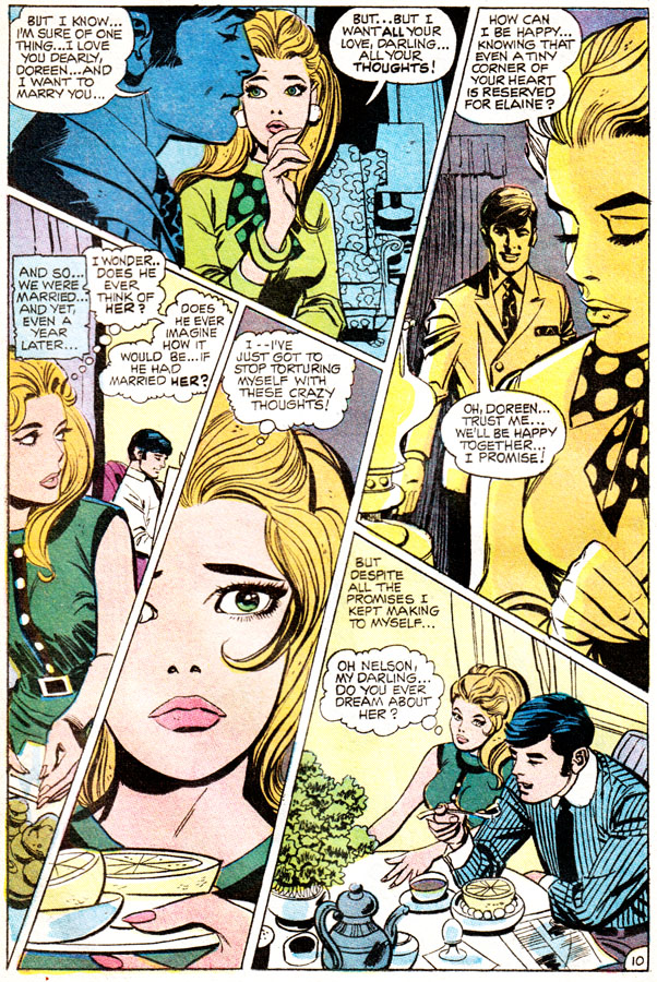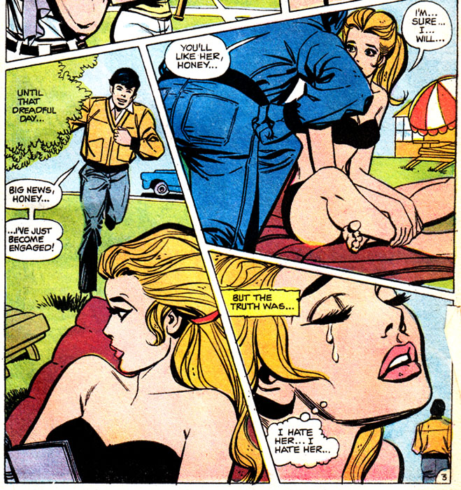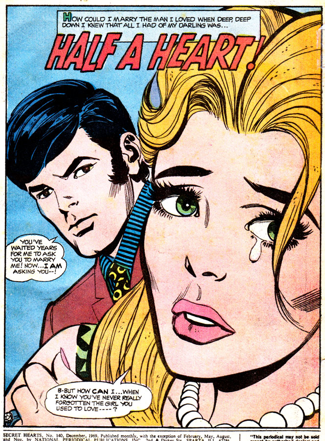 Pucker up your lips, lover boys and girls, it's time for some romance with those sexy swingers at DC Comics, who bring us a romance comic splash page so generic even Roy Lichtenstein would've rejected it.