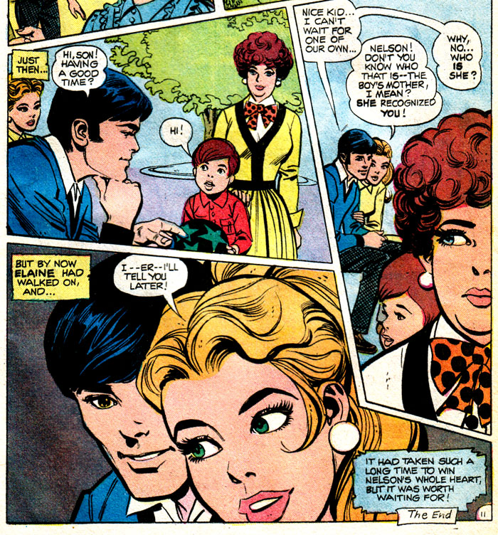 And then, a familiar-looking hair-do approaches with a son that we'll generously presume looks nothing like Nelson! And now all is right with the world, because Doreen can rest easy knowing that the ten pounds Elaine put on from childbirth has made her completely unrecognizable (to Nelson, who has the object permanence of a newborn). Now all Doreen has to worry about is not gaining any baby weight herself one day! Good luck Doreen, I hear Figurines work great at keeping you slim! Well, that and the diet pills.