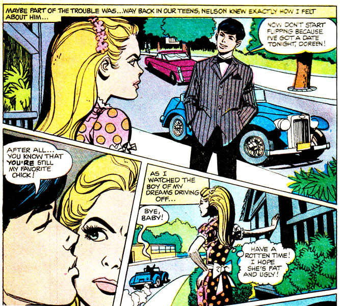 All love stories begin at the beginning, with the object of Doreen's one-sided obsession goes on a date with another girl, hopefully a fat and ugly one, in his jaunty jalopy, like the teens do, or did, or maybe they never did I don't know I'm not a million years old.