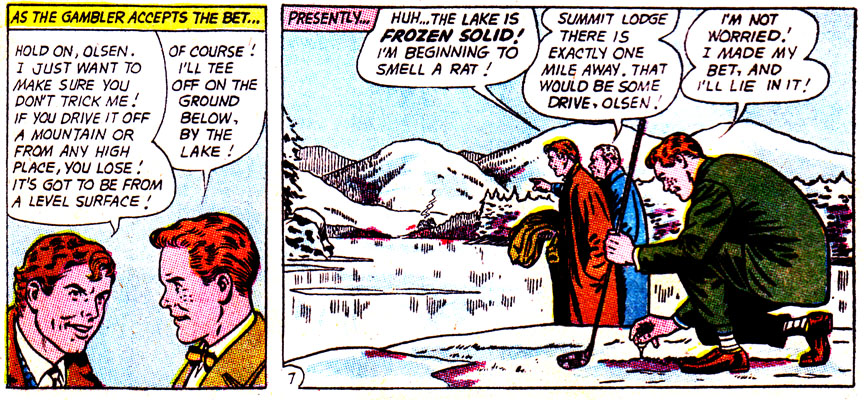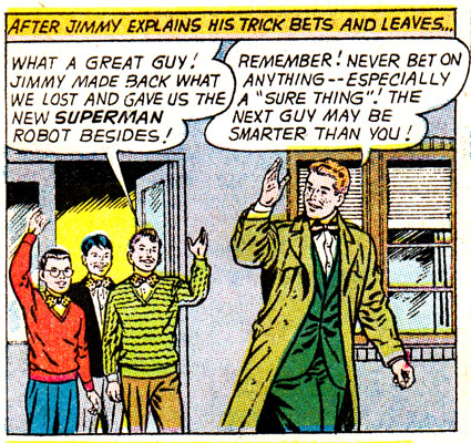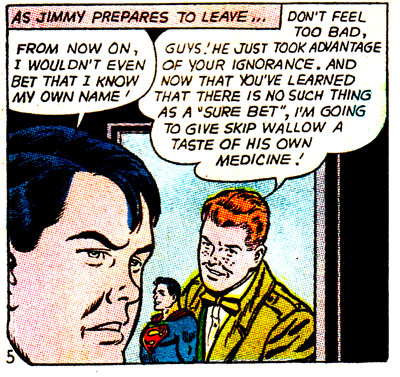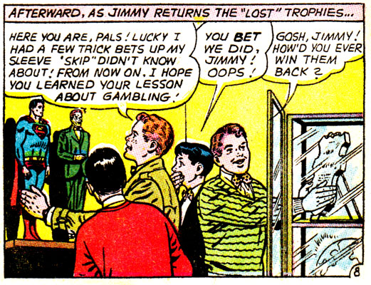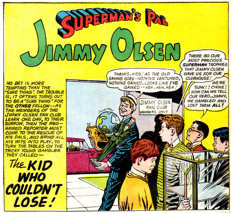 Of all the many vices present in the DC Universe, gambling is pretty low on the list, but that won't stop Superman's pal's fanclub from learning the hard way that betting is a one-way ticket to Losertown! And let's face it, kids who love Jimmy Olsen to the point of being in his fan club are all ready halfway there to begin with. Let's learn along with them, then, the dangers of gambling!