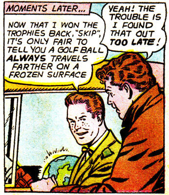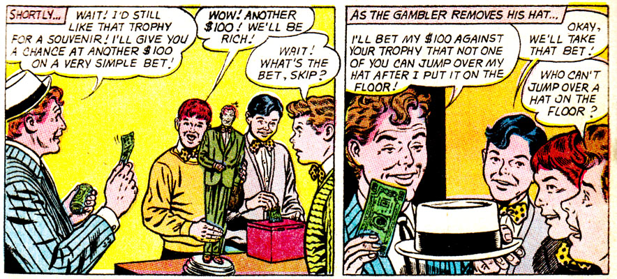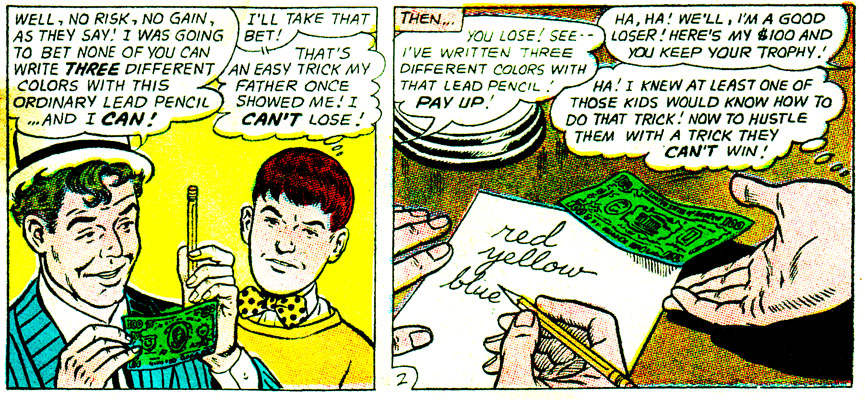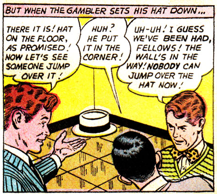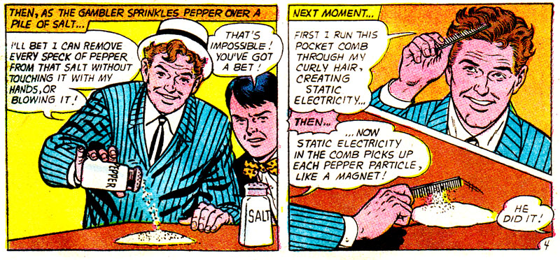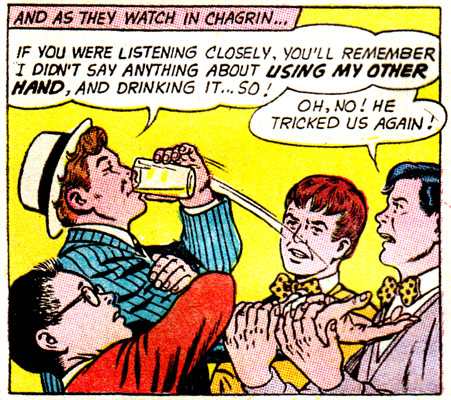 Well, these dumbos keep getting bamboozled by bar tricks for a few pages, so I guess sit back and enjoy? It never hurts to learn a few of these, in case you ever become a barfly, or want to start a new career as a "Mr. Wizard" for extremely bored children.
