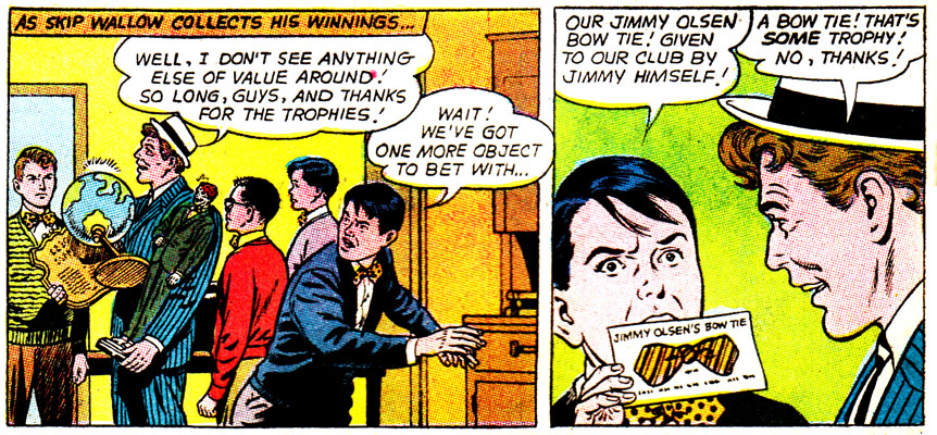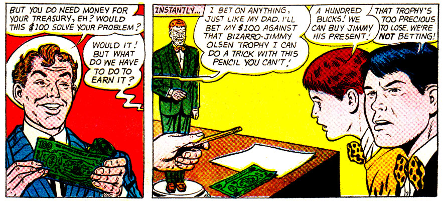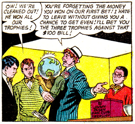 Okay, so a few questions: Who created that Bizarro Jimmy trophy, and why? A trophy usually implies a competitive prize of some sort, what was the competition? And why? What present did the fan club have in mind that would cost $100 in 1950s dollars? And why????