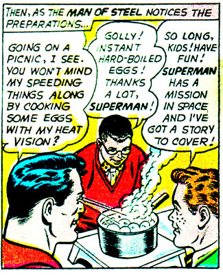 Superman can fly like an airplane, bend steel in his bare hands, and leap over tall buildings, but for these lameoids he'll heat their water to the boiling point so they can go on their picnic a couple minutes sooner.