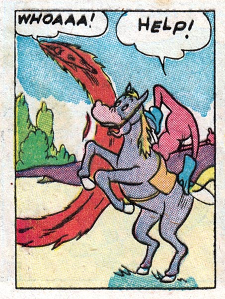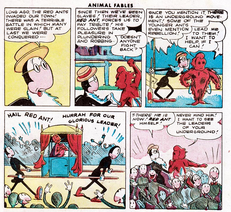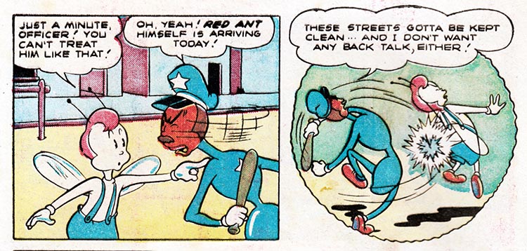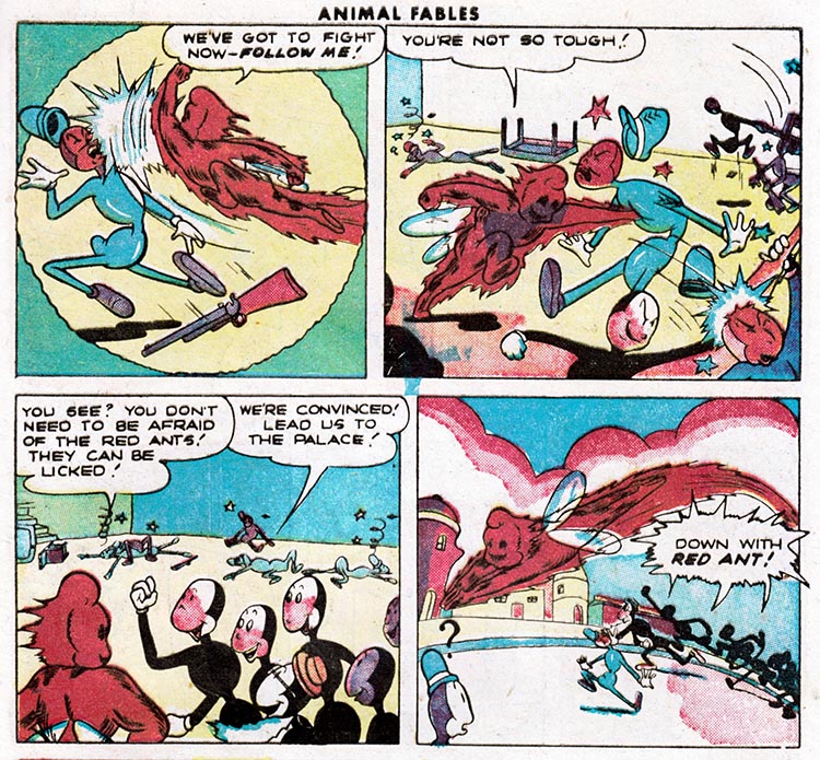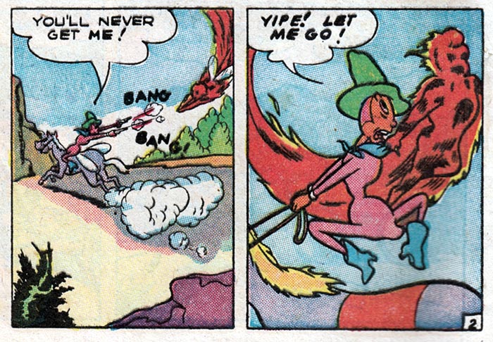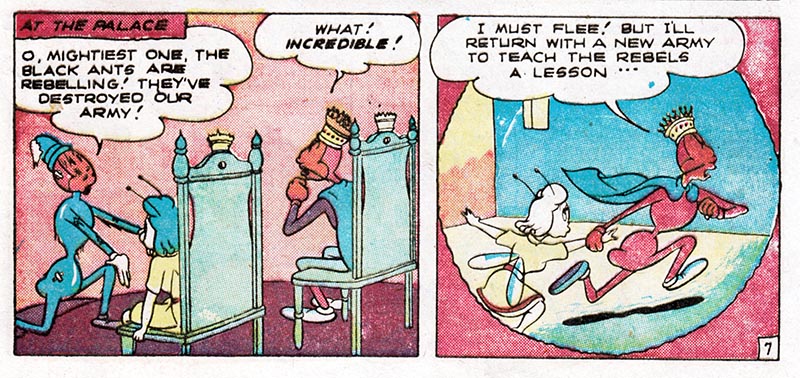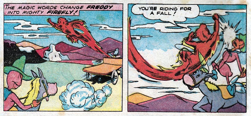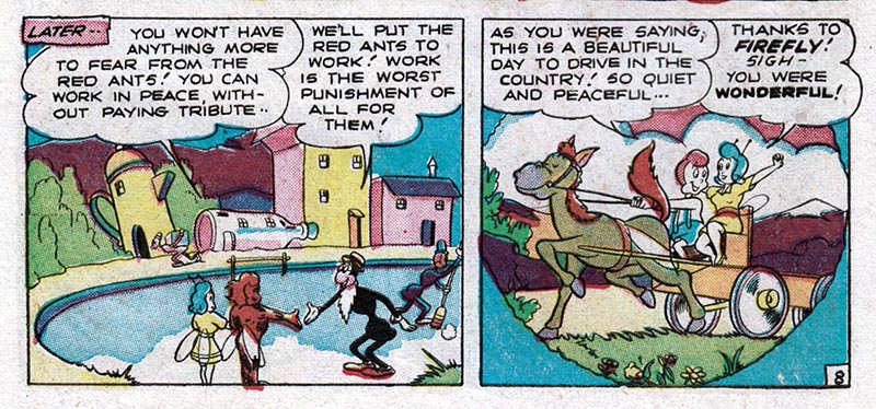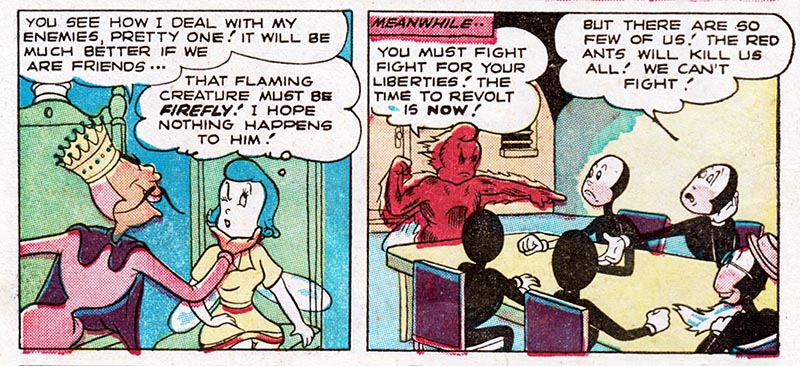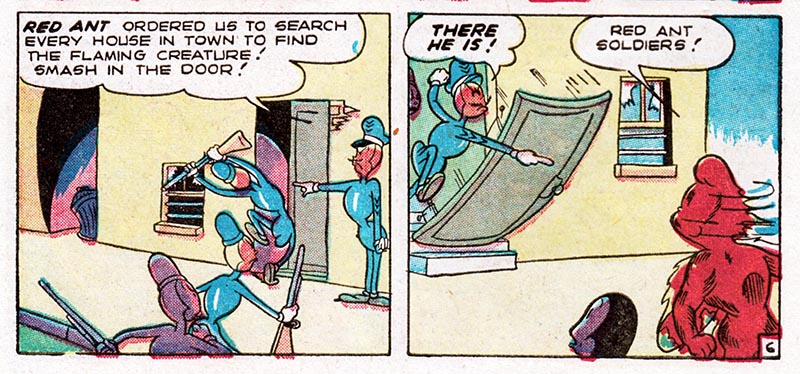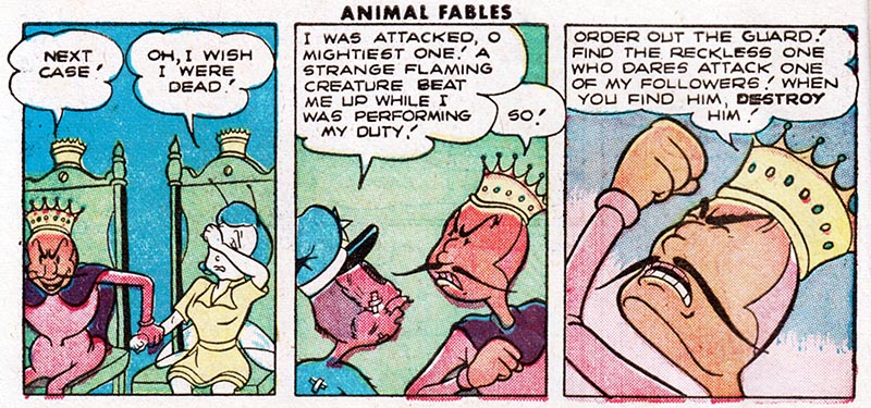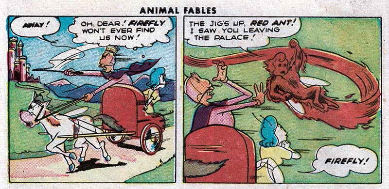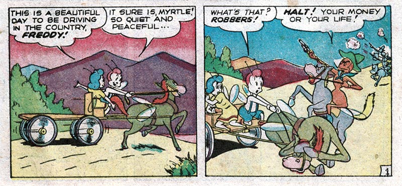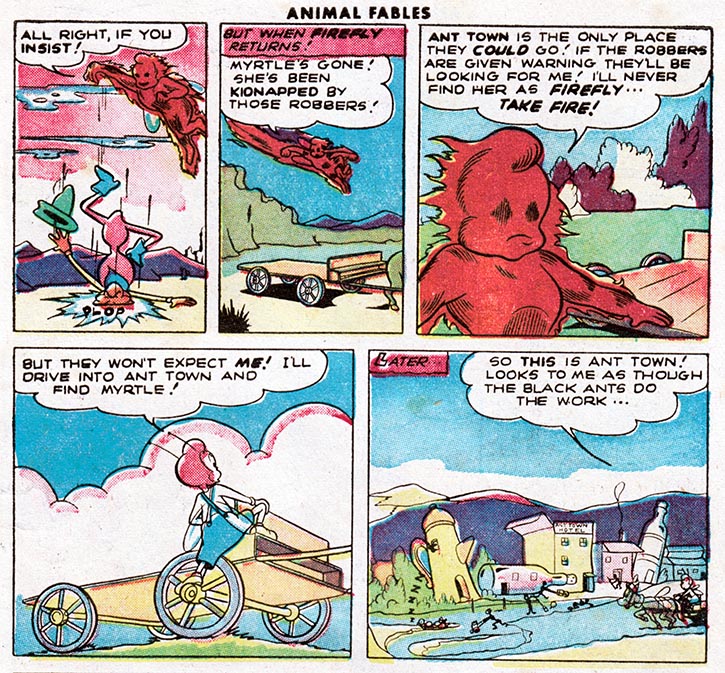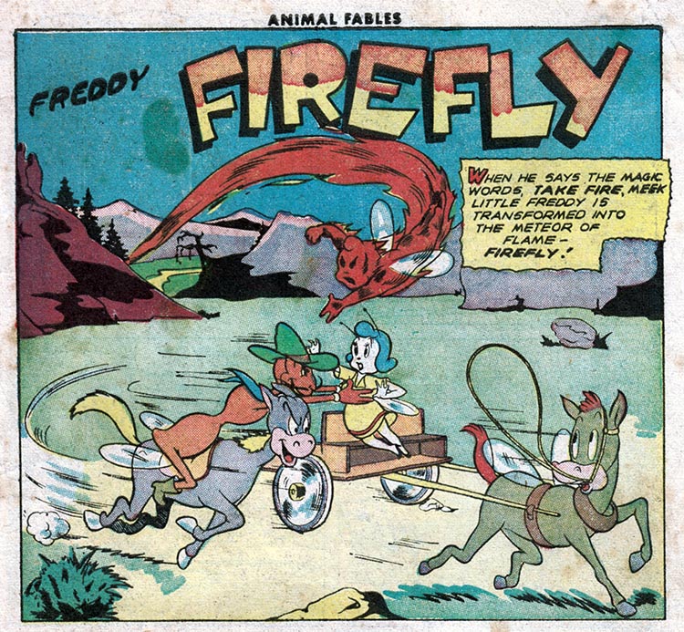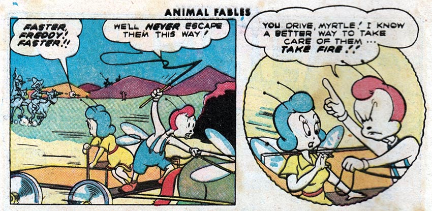 For instance, here in the fifth issue of pre-trend EC Comics "Animal Fables," we meet Freddy Firefly, a tiny insect version of the Human Torch, battling evil in an insect world where insect outlaws ride insect horses.