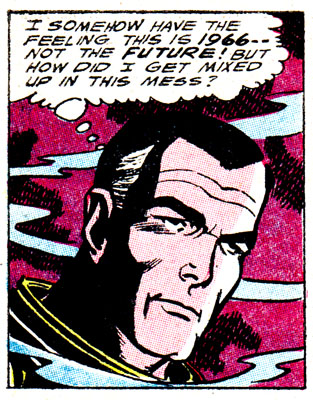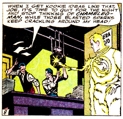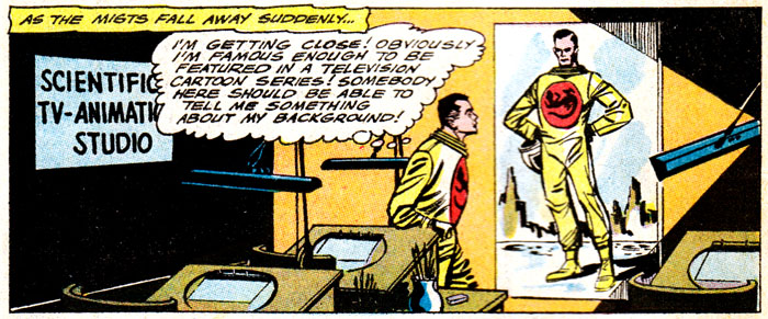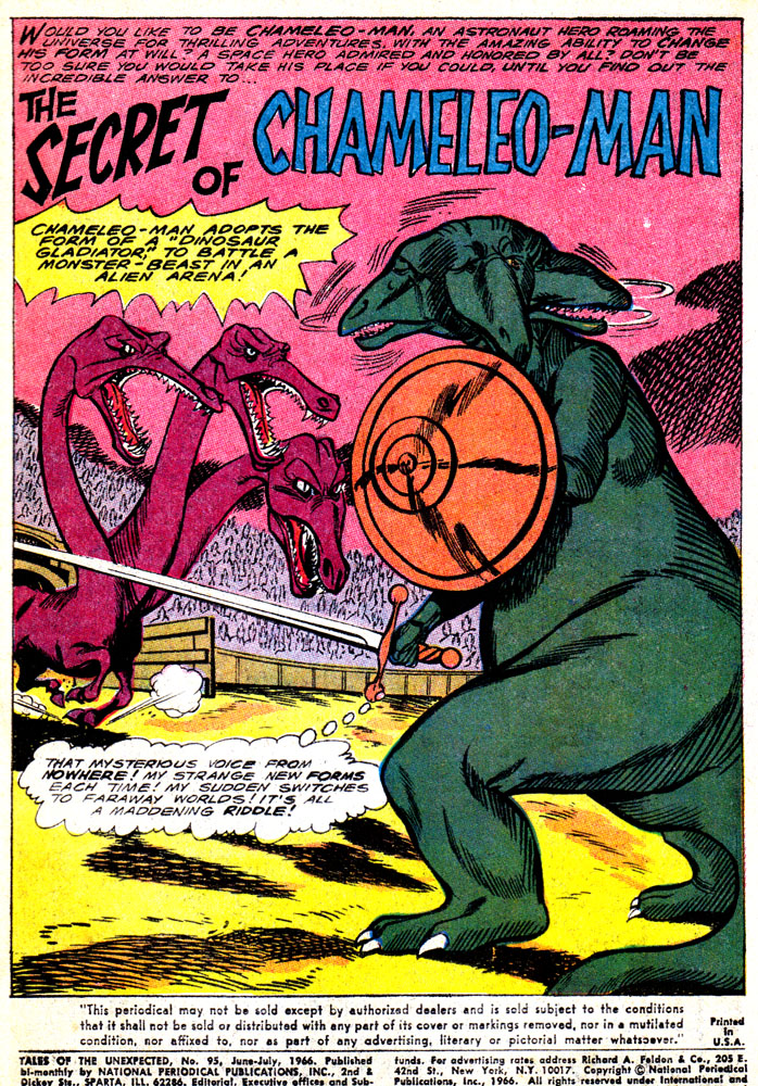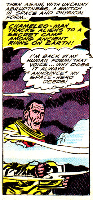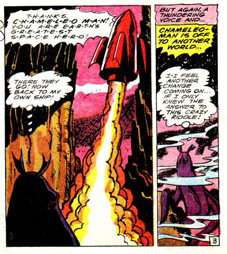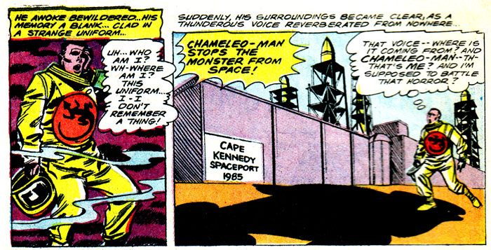 After that exciting splash page, we meet our astronaut hero roaming the part of the universe known as "Cape Kennedy", which was Cape Canaveral again by the time 1985 rolled around, but they didn't know that when this comic was made in 1966 so let's move on! Our astronaut hero knows nothing of this place called "Florida", he's merely a blank slate in a spacesuit. A spacesuit with a doofusy looking chameleon on the front like a Ben Cooper Halloween costume.