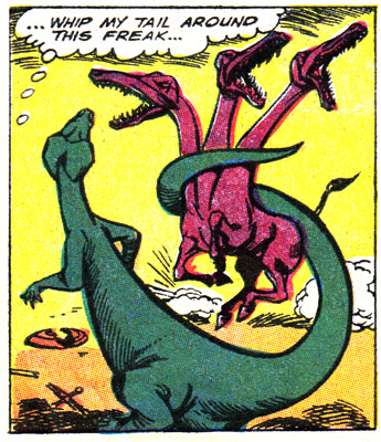 Once again Chameleo-Man, whose powers are uncannily similar to a chameleon, uses his special "squeeze hard" move to defeat the 3 headed monstrosity!