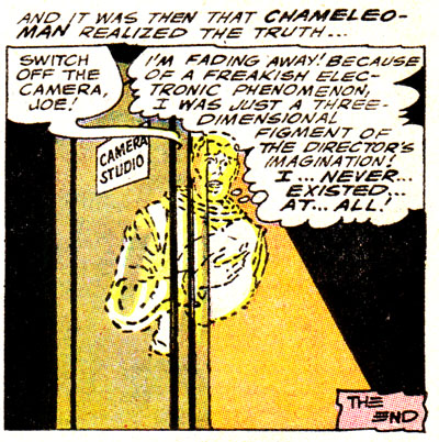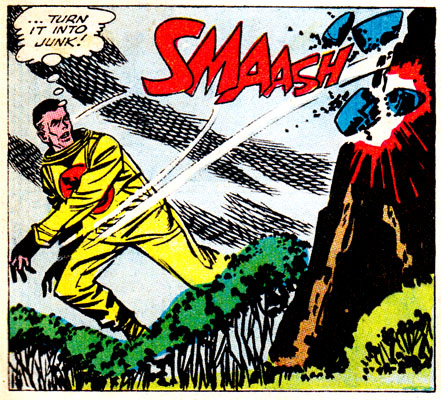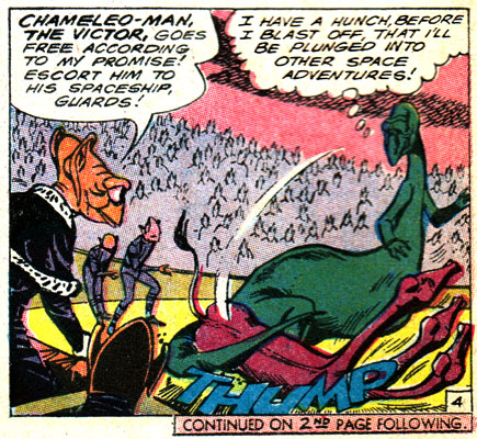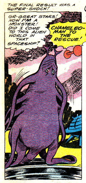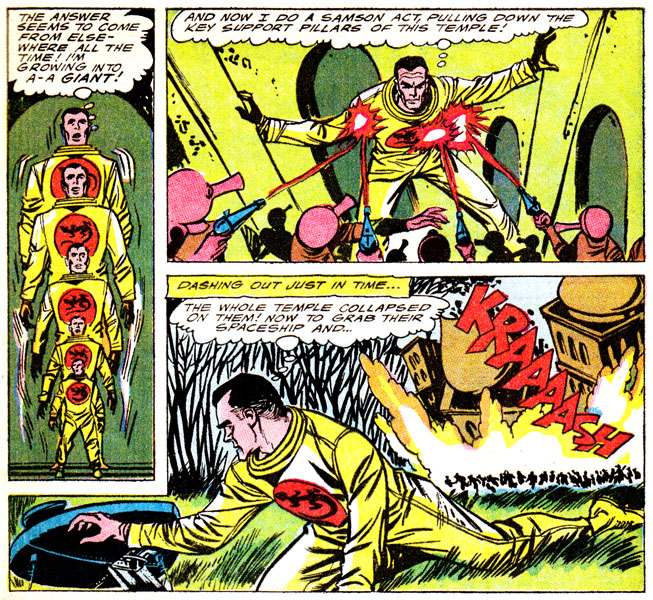 Instead of turning into another giant animal, he turns into a giant Chameleo-Man, murdering the aliens as the temple collapses upon them (relax, this is a Comics Code comic, those little black blobs are the aliens escaping the destruction).