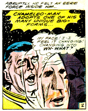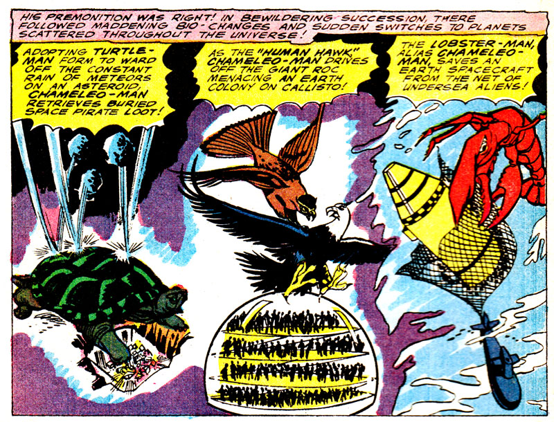 True to his name, Chameleo-Man changes colour slightly to blend in with his surroundings errrrrr I mean changes form completely into different types of animal creatures to save more dumb Earthlings who clearly can't handle life in outer space, and also to steal pirate loot.