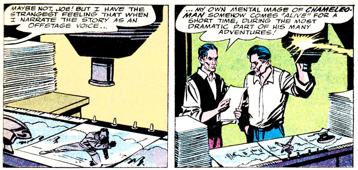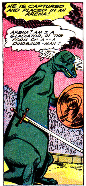 Now we return to the scene of the splash page, thankfully we are spared the excitement of seeing him get captured. Meanwhile, Gene Roddenberry reads this comic upon its original publication, furiously taking notes about "dinosaur men" and "space gladiators".