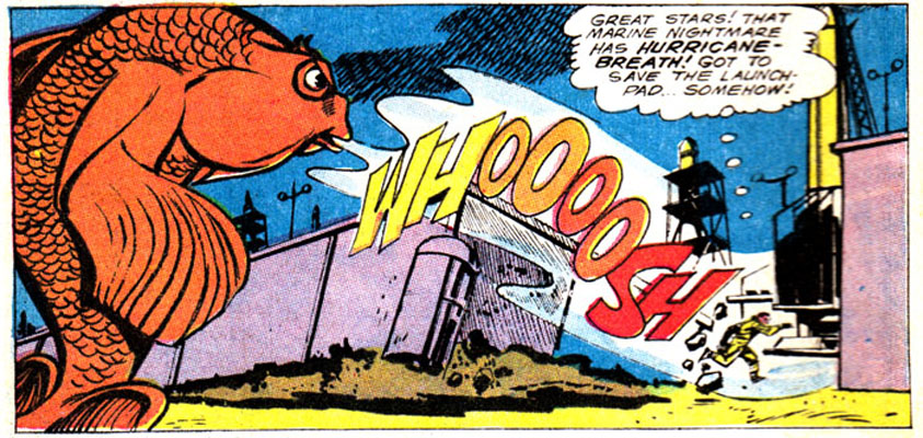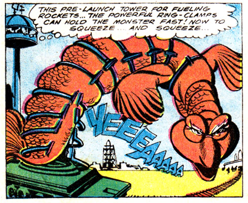 Look, I don't wanna say this story's a little disjointed but I've been staring at this for like an hour and can't figure out how he got those clamps around that fish monster. He's up in the pre-launch tower and controlling the tightness of the clamps but that doesn't explain how the monster got there in the first place??? And that's just ignoring the fact that a fish monster is rampaging on dry land, which, don't even get me started!