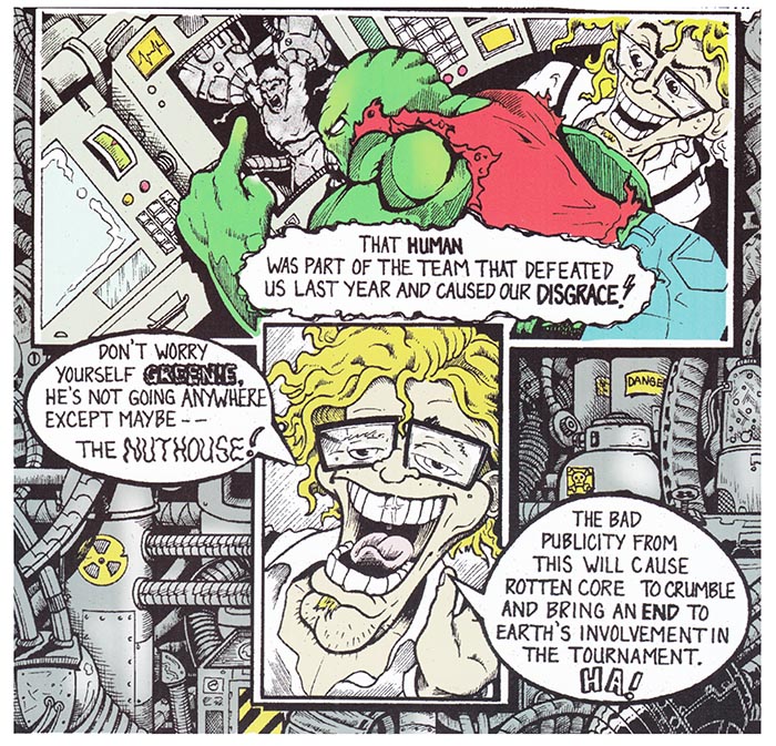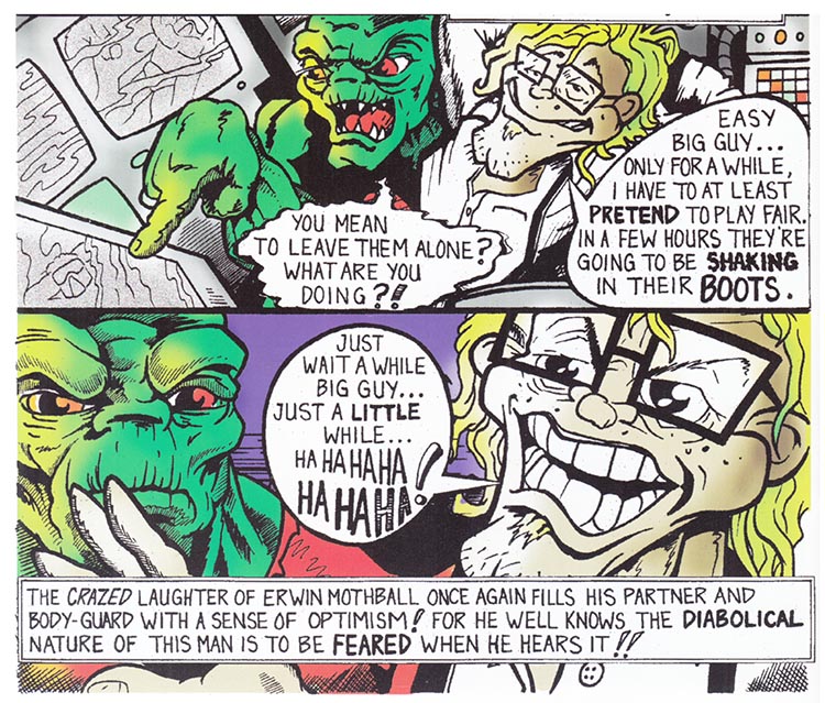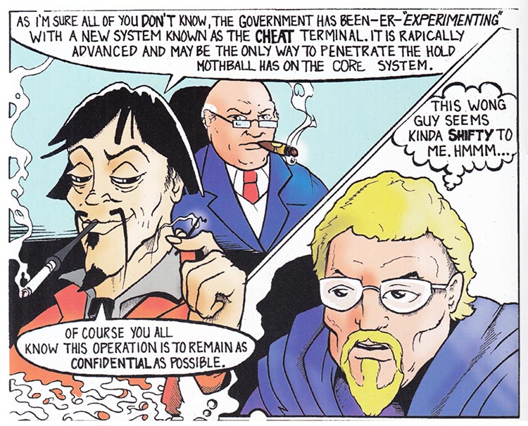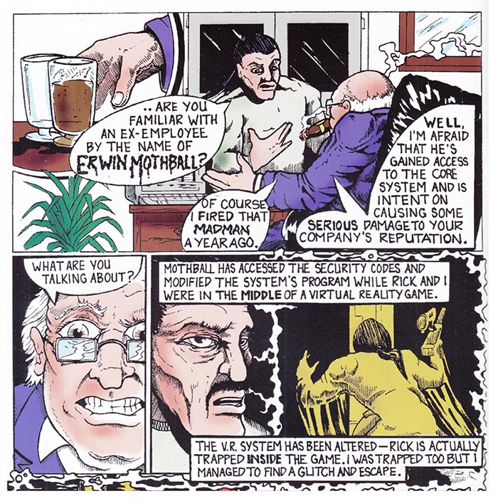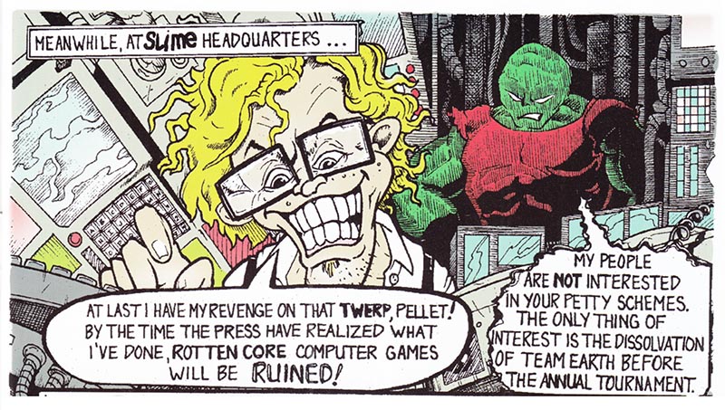 Meanwhile at Cartoonishly Evil Bad Guy Headquarters, the brilliant yet insane Erwin Mothball finalizes his plans to completely destroy a computer game company. Buddy, they are a COMPUTER GAME COMPANY. Chances are they're gonna go out of business soon no matter what you do.