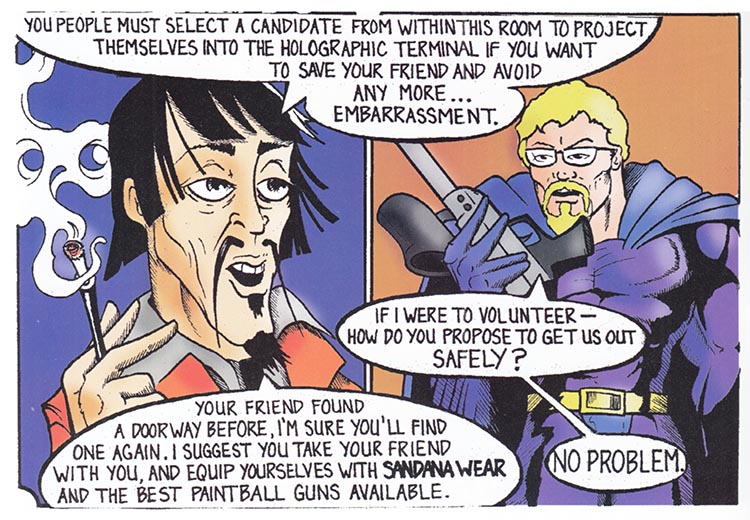 Now equip yourselves with Sheridan brand paintball guns and the finest SANDANA WEAR and get ready to... play a computer game, in which what you are wearing or holding doesn't matter in the slightest! Way to sell your gear there, comic!