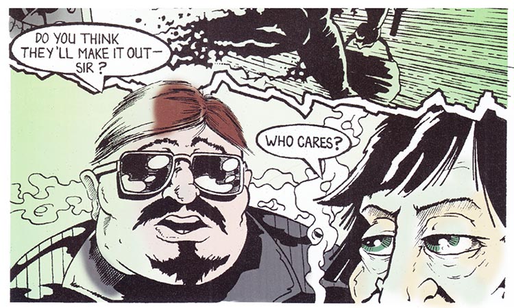 Finally, a comic book with the balls to admit nobody gives a crap whether the main characters live or die. I am more interested in these two guys, who look like they wandered in from an underground comic somewhere, probably one filled with sex and drugs and hilarous stoner hijinks involving sex and drugs. Maybe cars too, that sunglasses guy has kind of a Car-Toons vibe going on.