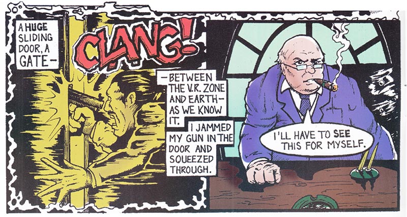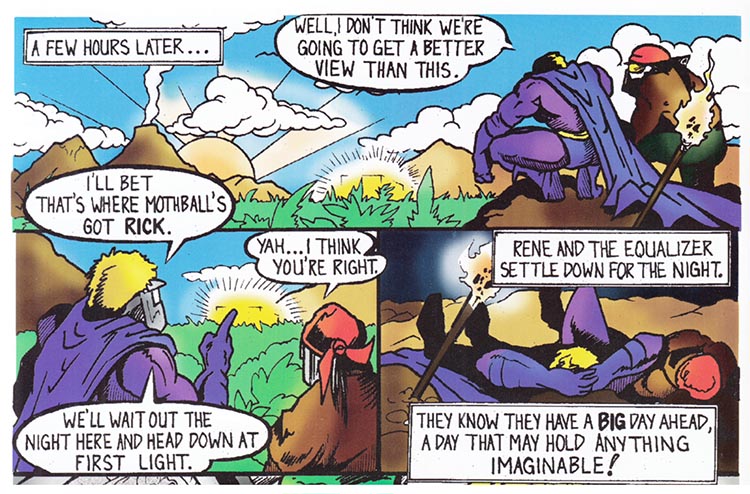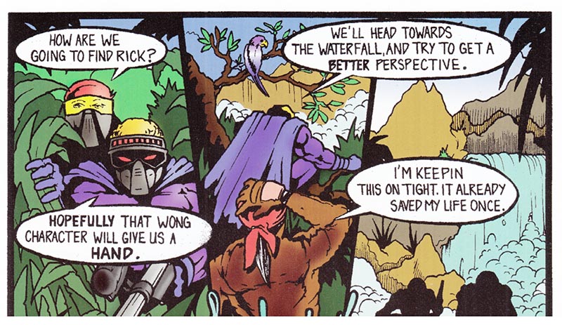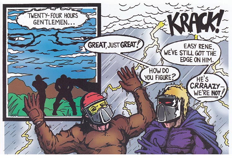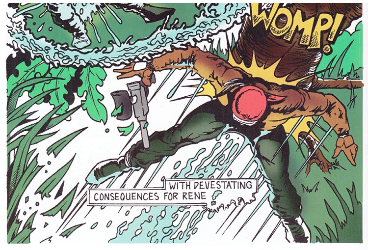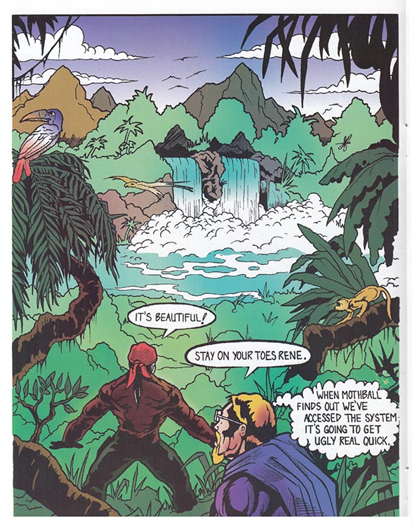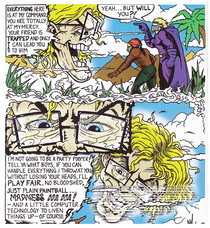 Real paintball - at least the last time I played paintball, which was around the time this comic book was published - is played in chewed-up woodlots where every tree trunk has been scraped raw by paintballs and the shoulder pads of players taking cover from paintballs, where all the underbrush has been stomped into oblivion, and ugly packing crates and shipping skids are deposited randomly. In short, nothing like the beautiful natural wonderland seen in Virtual Reality paintball, which again makes me question exactly how this comic book is promoting paintball. Because so far, it's not.