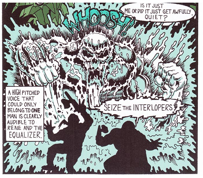 When a narrative begins in the middle of a story and fills in background events through dialog or context, this is called "in media res" and it's a classic element of many enduring works of literature. Here, it just makes us think of the more interesting comic book the creators could have given us, instead of looking at some green guy talk to some weirdo's curling tongue.