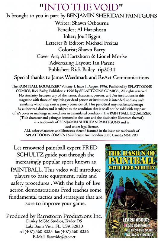Brought to you by Benjamin Sheridan Paintguns, this comic is published by "Splattoons Comics," no relation to the popular similarly-named paintball themed video game. If you're unclear about the equipment and tactics of paintball, why not enjoy a VHS tape all about the sport? Let Fred Schultz guide you through the sport, after you write or email the video company and ask them how much it costs, because this advertisement has forgotten to include that data. Maybe one too many paintballs to the head there.