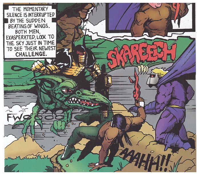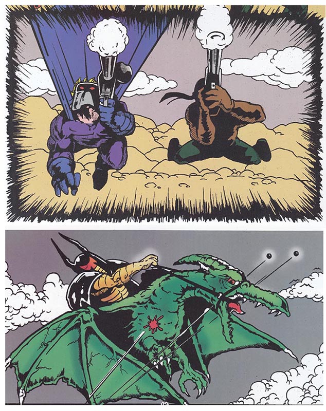 What is all this poc poc poc, splat splat stuff, what's happe... Oh, that's right, this comic book is supposedly about paintball people doing paintball stuff. You'd think a comic book onstensibly meant to promote paintball guns and gear would maybe feature some players using the gear in a typical paintball game situation, maybe demonstrate the product's superior quality and features. Instead we get dragons and water monsters in a mad scientist's VR world, which only promotes hatred of science, computers, and reality in general.