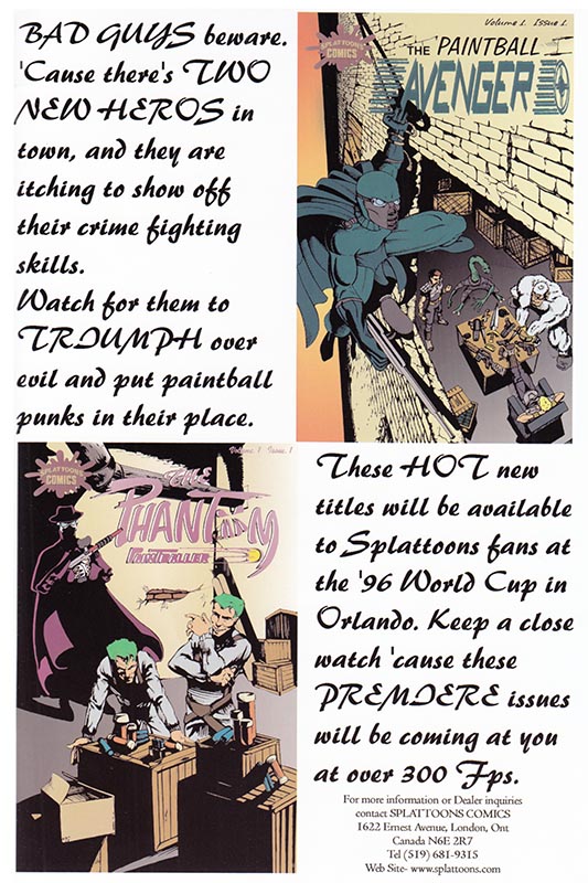 Well, they certainly did. Watch for these paintballing powerhouses to TROUMPH over evil in their PREMDERE issues, which according to this advertising copy will be fired in your direction at painful velocities during the 1996 National Professional Paintball League World Cup in Orlando!