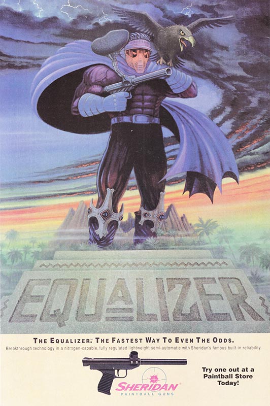 The Equalizer! The choice of purple-garbed virtual reality paintball mystery men everywhere! Cape and screeching bird not included. Use of protective face and head equipment is essential. Not for use indoors. Must be 18. Void where prohibited by law. May not work as advertised in special virtual reality scenarios engineered by mad scientists and unidentified green aliens.