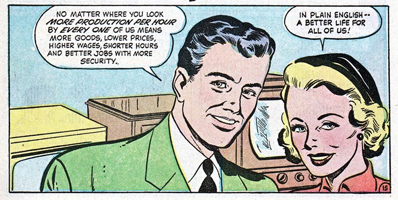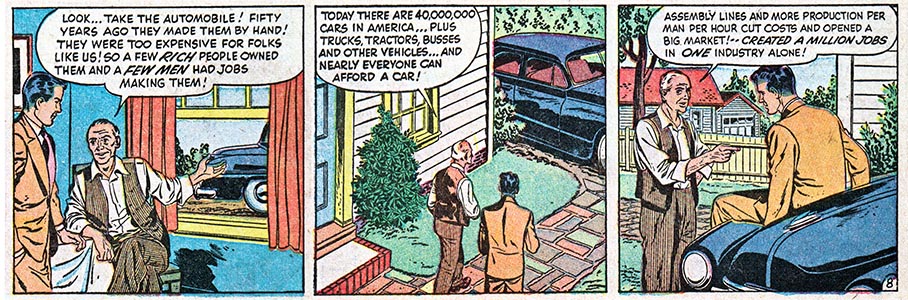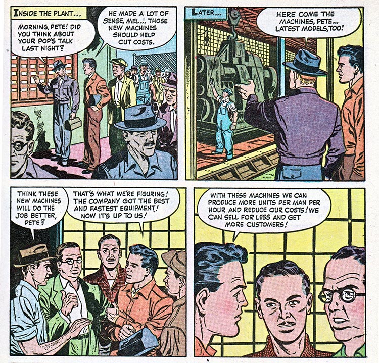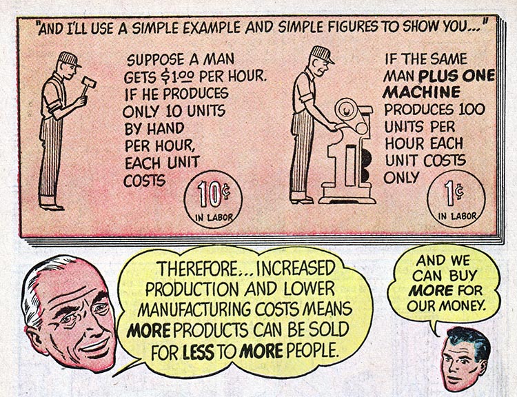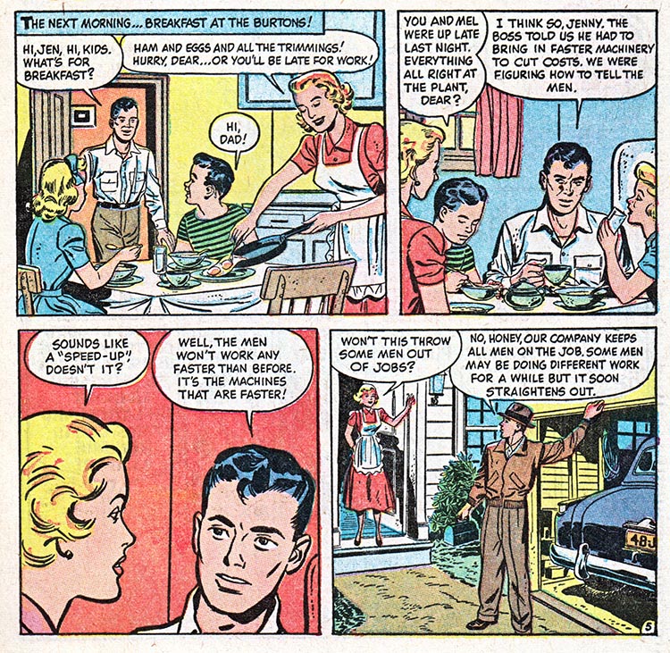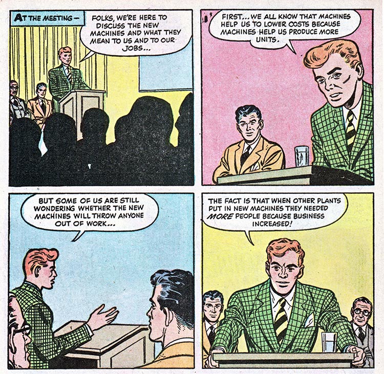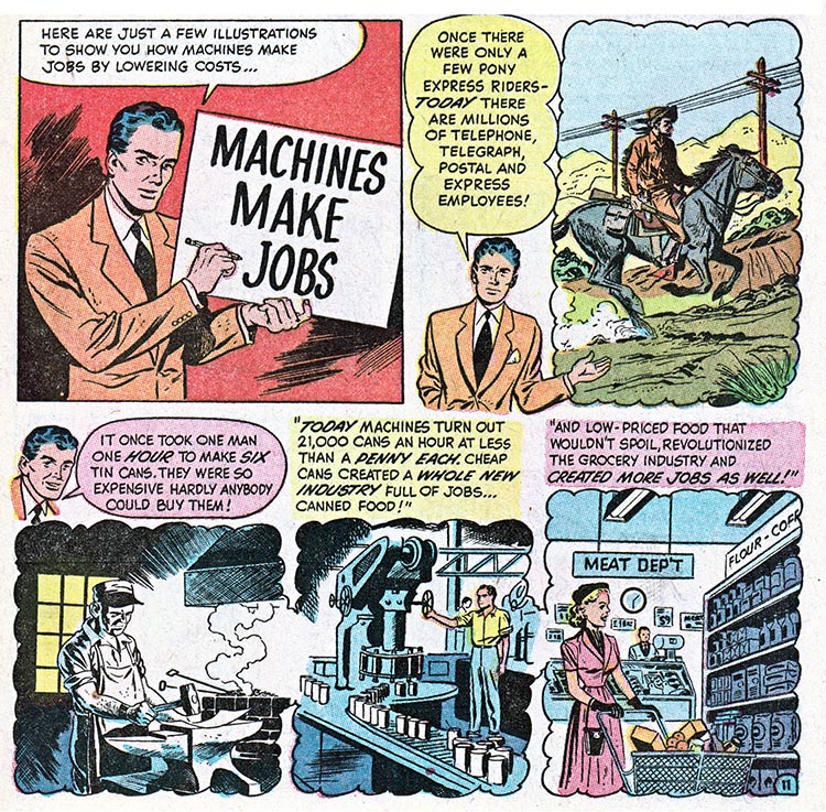 Do you know???? It's possible to create an entire public information comic book extolling the virtues of mechanization and its positive effect on employment, without ever offering a citation or a reference or even a Bureau Of Labor Statistics quote! Why, this whole thing might just be baseless corporate propaganda commissioned by some giant conglomerate eager to soothe their workforce and ease their fears about looming mechanization. Now hurry and get dressed, the boss wants to see us!