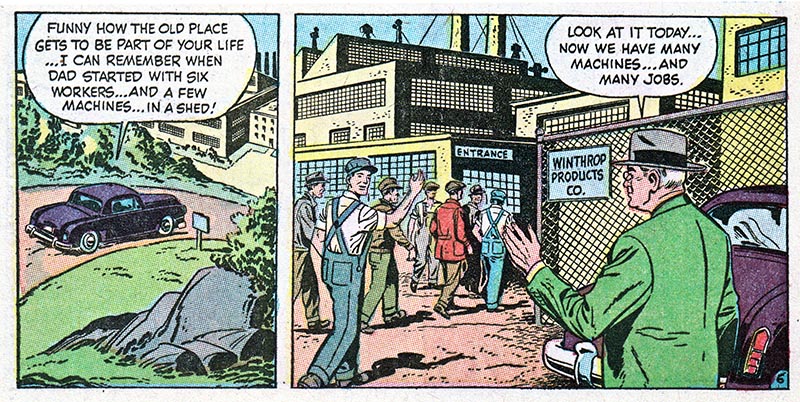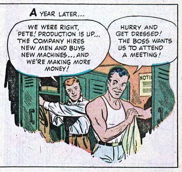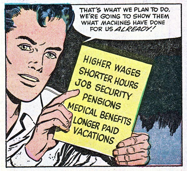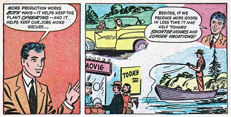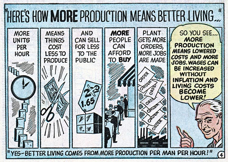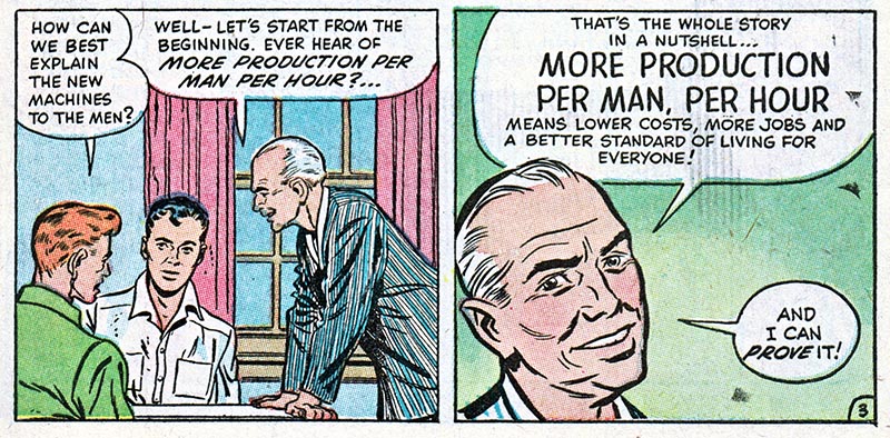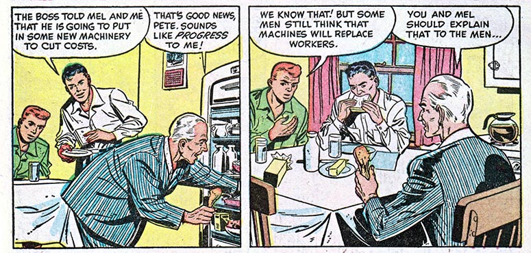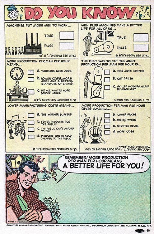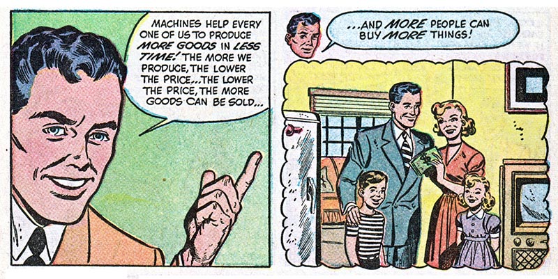 Do you know???? It's possible to create an entire public information comic book extolling the virtues of mechanization and its positive effect on employment, without ever offering a citation or a reference or even a Bureau Of Labor Statistics quote! Why, this whole thing might just be baseless corporate propaganda commissioned by some giant conglomerate eager to soothe their workforce and ease their fears about looming mechanization. Now hurry and get dressed, the boss wants to see us!