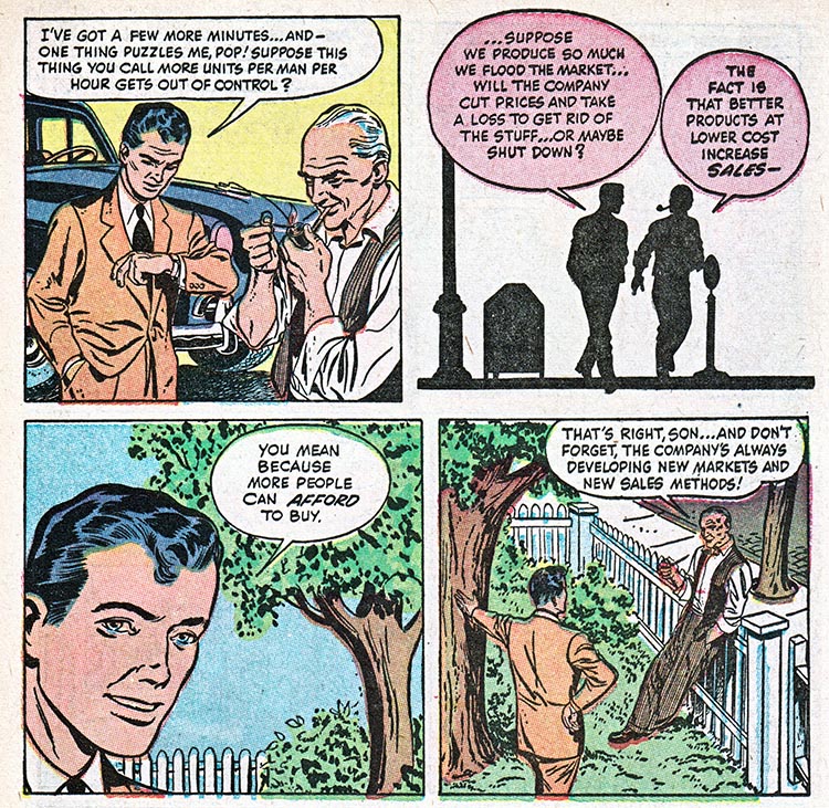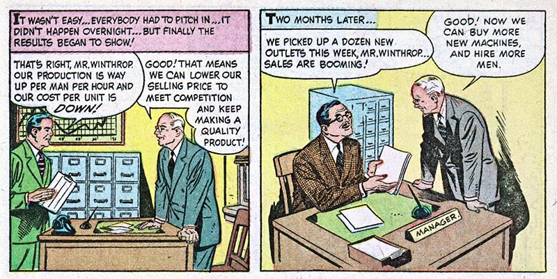 Less cost per unit means the company will sell the items cheaper, and... oh. I see the flaw in this reasoning already, in that the company will instead charge whatever the market will bear for their widgets, regardless of cost, and when the company becomes unprofitable, venture capital will roll up, buy the outfit for pennies on the dollar, use it as collateral for huge loans, and then let it default and go bankrupt. But I'm getting ahead of the story, America won't be into that particular cycle until the 1990s.