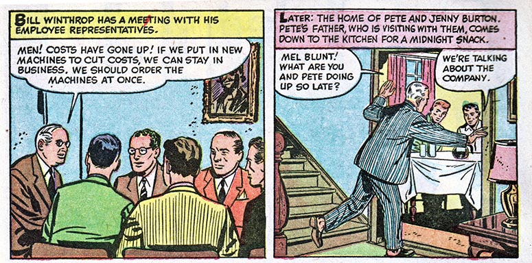 The scene of Bill Winthrop meeting his employee representatives barely starts before WHAM we're in the middle of a pajama party in Pete Burton's kitchen. Maybe some new machines would help with this whiplash.