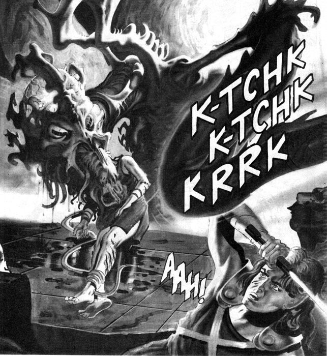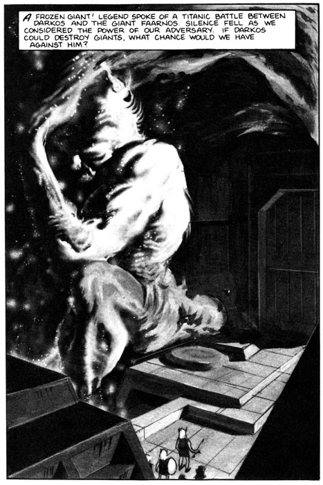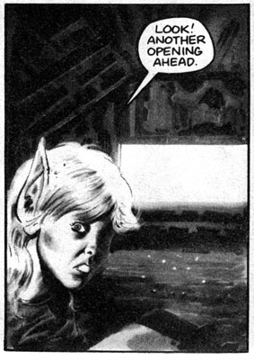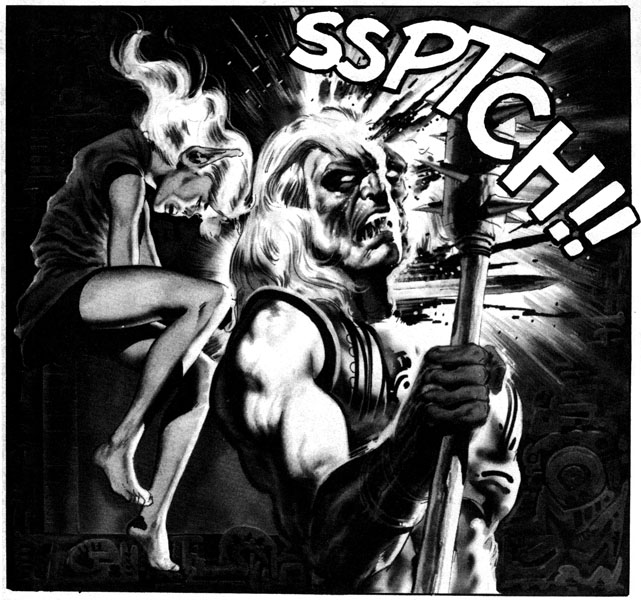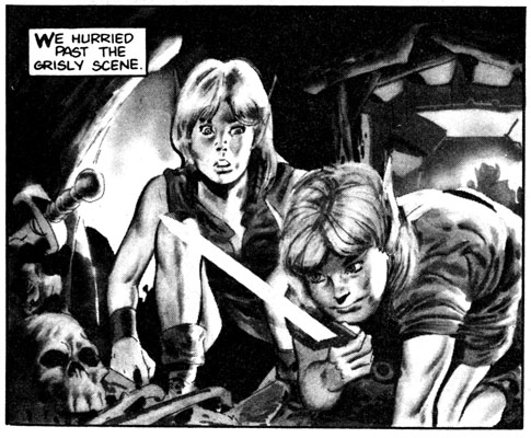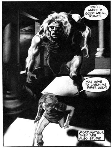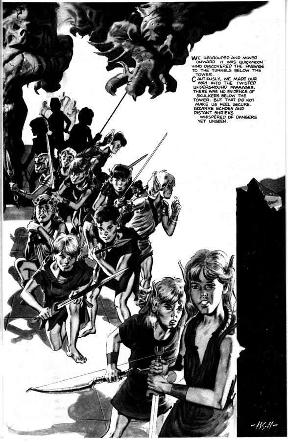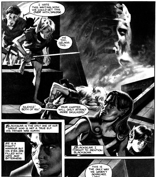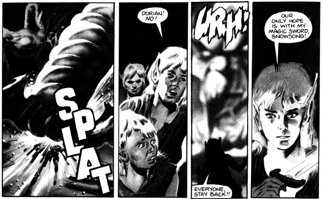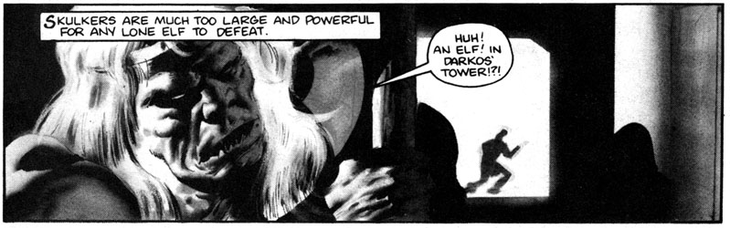 If you overlook the elves storming a castle in their goddamn bare feet, there is some pretty cool art, like this half-page of an orc, I mean Skulker, getting his head sliced in half.