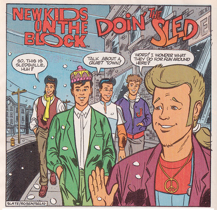 Back in the 1900s the music industry spent decades furiously manufacturing teen idols, chosen for looks instead of musical talent or authenticity. I'll pause while everyone over the age of 30 reels from the usage of the term "the 1900s," and then we'll admit that the music industry is still working from this same exact playbook. But in the early '90s there was but one laboratory-generated boy band to rule them all, and they were known as the New Kids On The Block. Did they have their own comic book? No! They had a "Rockomic."