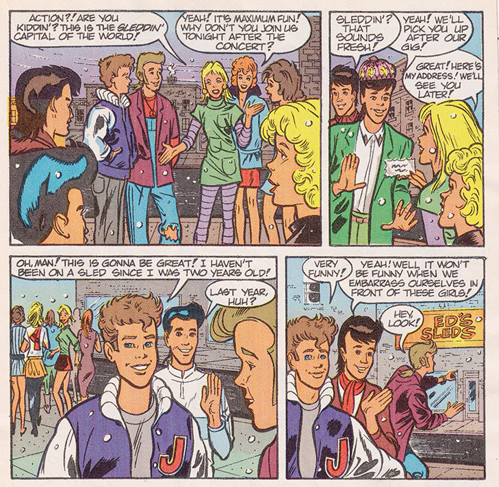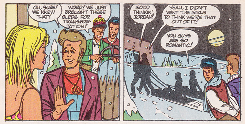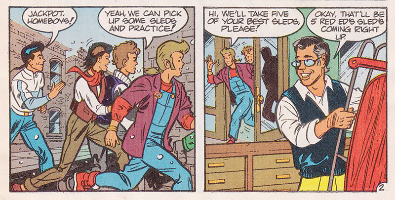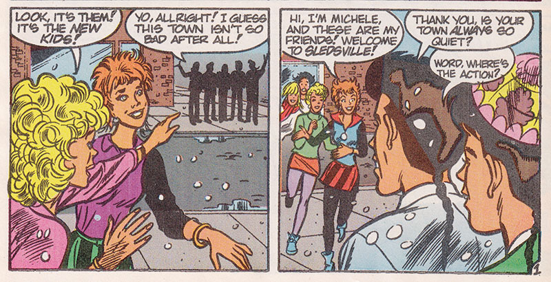 Sledsville had a sled store, so now I'm assuming they're in Globeton or maybe Globeopolis, which makes it easy to acquire a globe so that this mystery girl can point out where she came from so that she can go back to where she came from. That's right, she had herself shipped to the New Kids, and immediately upon meeting the New Kids, began trying to get away from the New Kids.
