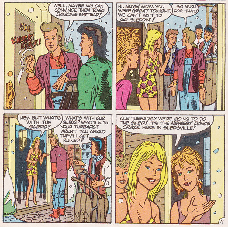 Hilarious confusion abounds as the girls explain when they say "sleddin'" they mean a new dance craze nobody's ever heard of, and not the actual common activity the town is named for and has at least one retail establishment devoted to.