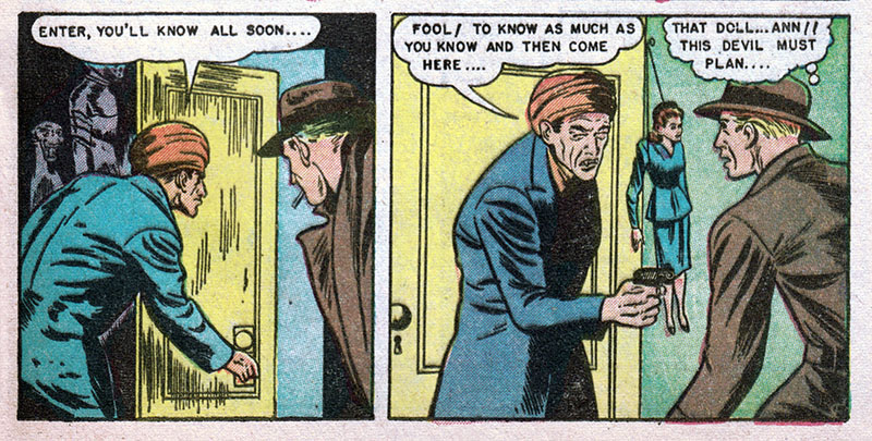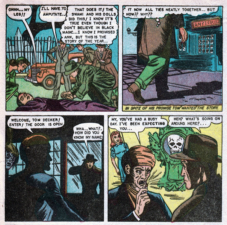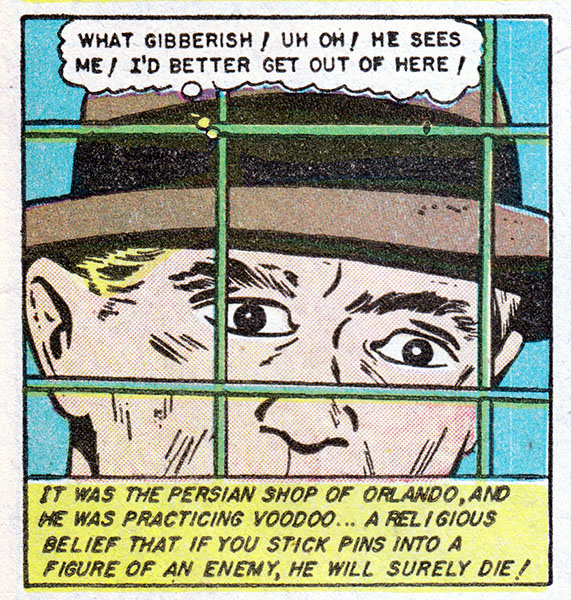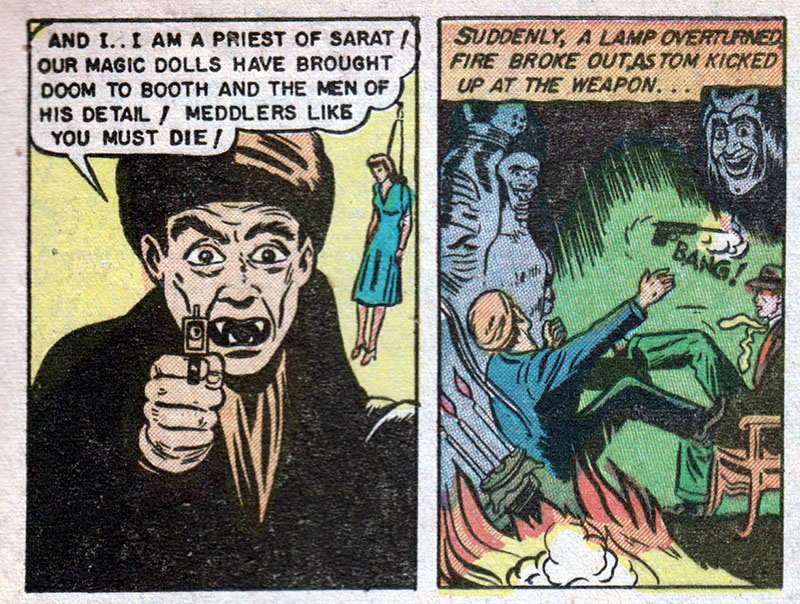 Consumed with mystical powers from beyond the grave, our voodoo swami threatens Tom with all the awesome witchcraft of... a small-caliber automatic.