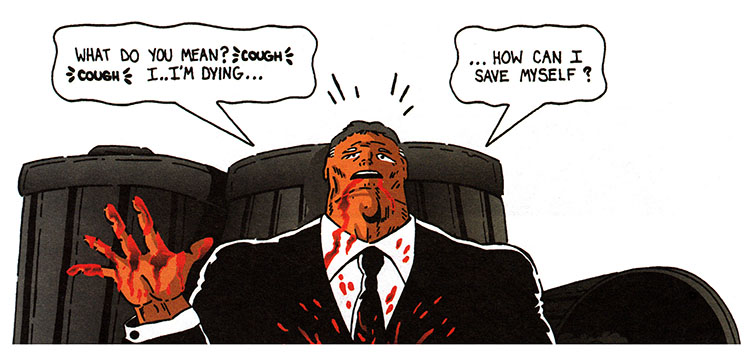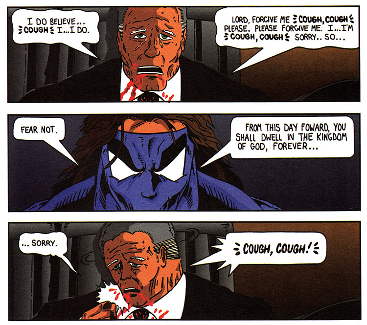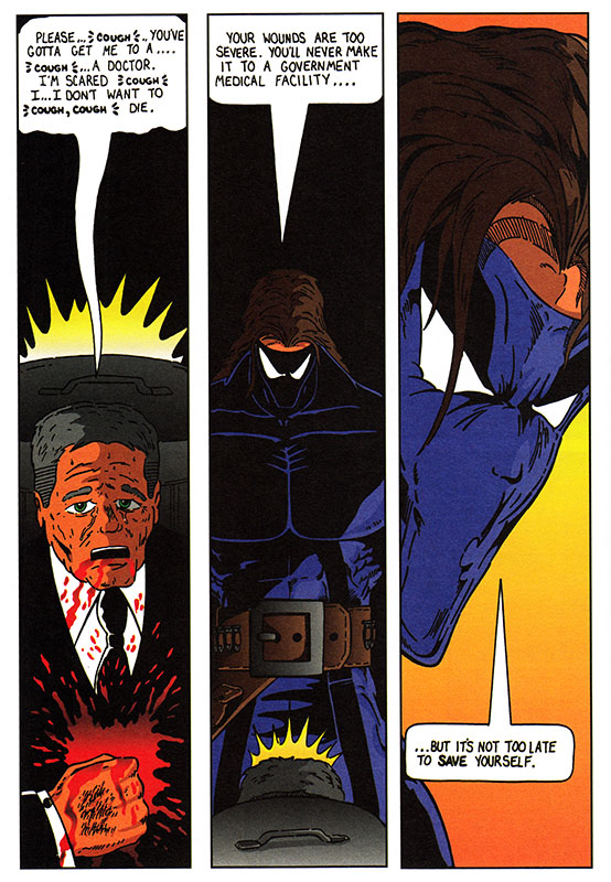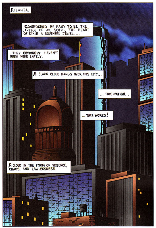 This poor guy could definitely make it to one of the many hospitals in downtown Atlanta- Grady's trauma center is world class. This comic's writer would know this if they'd bothered to learn anything about the city they decided to set their masked born-again end-times vigilante comic in. Been a while since I last got stitched up in Crawford Long, but Atlanta hospitals are indeed a thing.