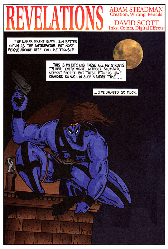 His name is Brent Black, but he's better known as the Anticipator. Who is, in turn, better known as "trouble." He's changed so much in such a short time! Mostly thanks to the inflatable-muscles suit he bought, and his spinal dislocation.