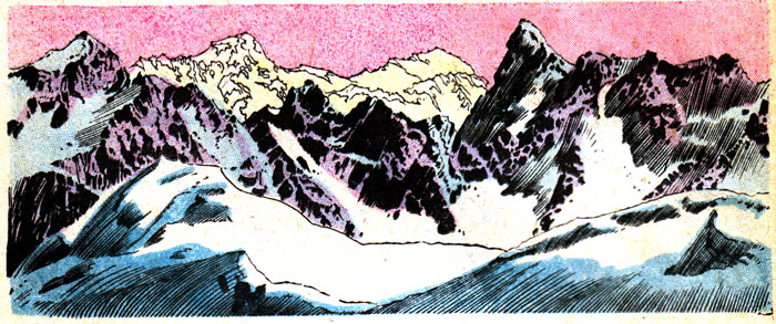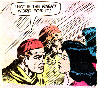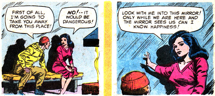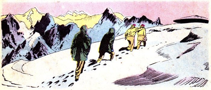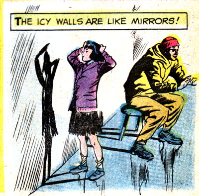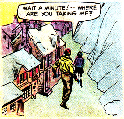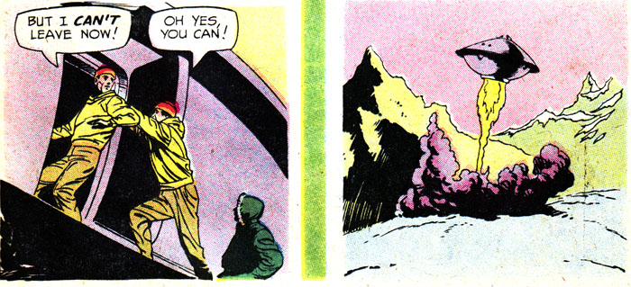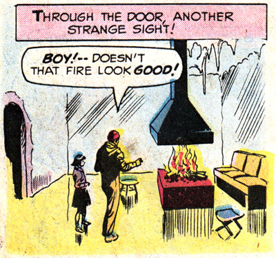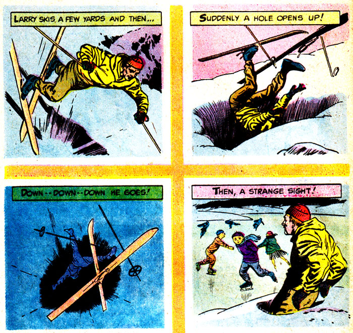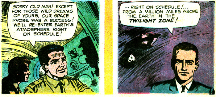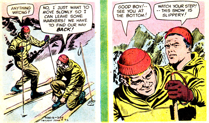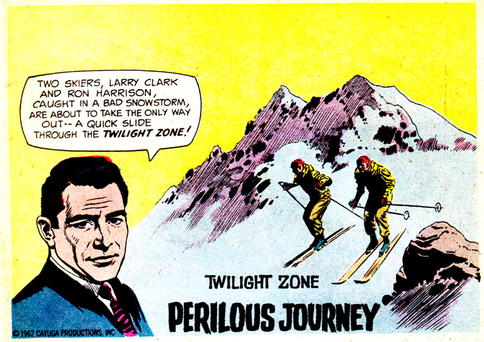 It's time to take a Perilous Journey to the Twilight Zone, courtesy of this reasonable facsimile of Rod Serling. You can tell this comic wasn't written by Rod himself because, among many other obvious things, there's tons of empty space in this panel that would've been filled with evocative, elegant prose, or at least something other than #ffff00. Unless all that blank yellow stuff is meant to represent a snowstorm, in which case I hope they find shelter immediately!
