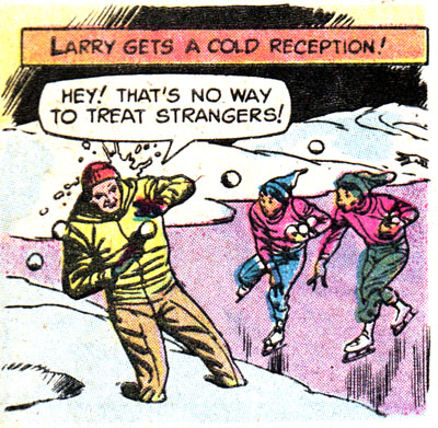 It's a good thing Larry has this little girl there to tell him to go AWAY from the flying snowballs, otherwise he'd be stuck there all day.