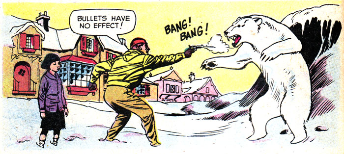 Our top story tonight: Dumdum in yellow snowsuit fires wildly at stuffed bear in a Santa's Village, somehow manages to miss. Film at 11.
