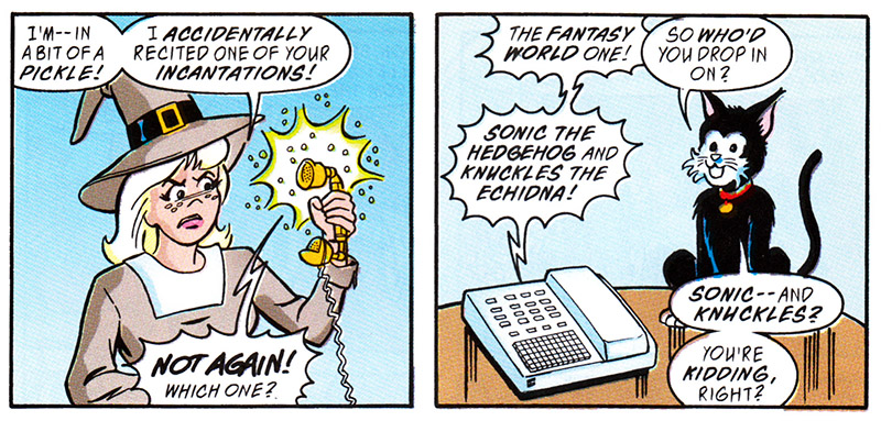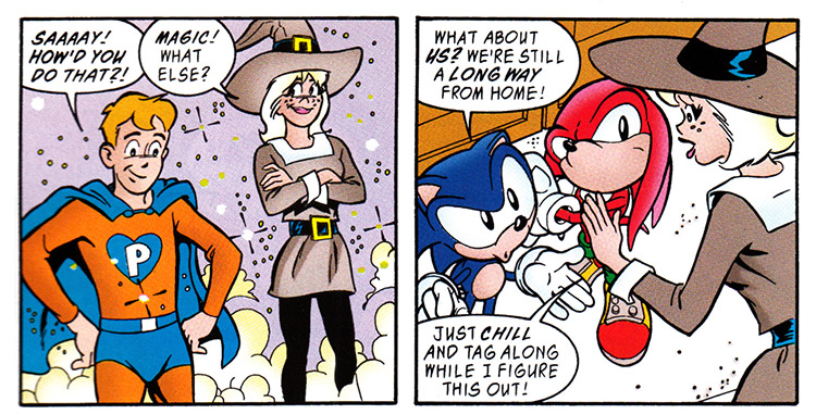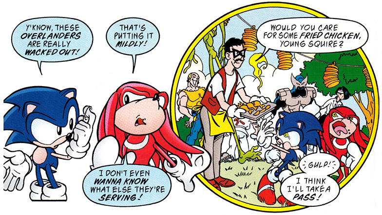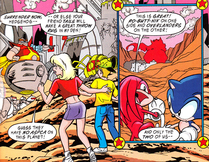 And they're in the world of the Sonic The Hedgehog comic, a fantastical world of amazing wonders where apparently the hide of a foot-tall animal is considered prime floor covering material. From what I know about Sonic, the slightest nudge will cause rings to erupt out of every character. I'm looking forward to seeing a lot of flying rings here!