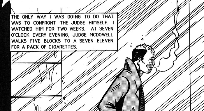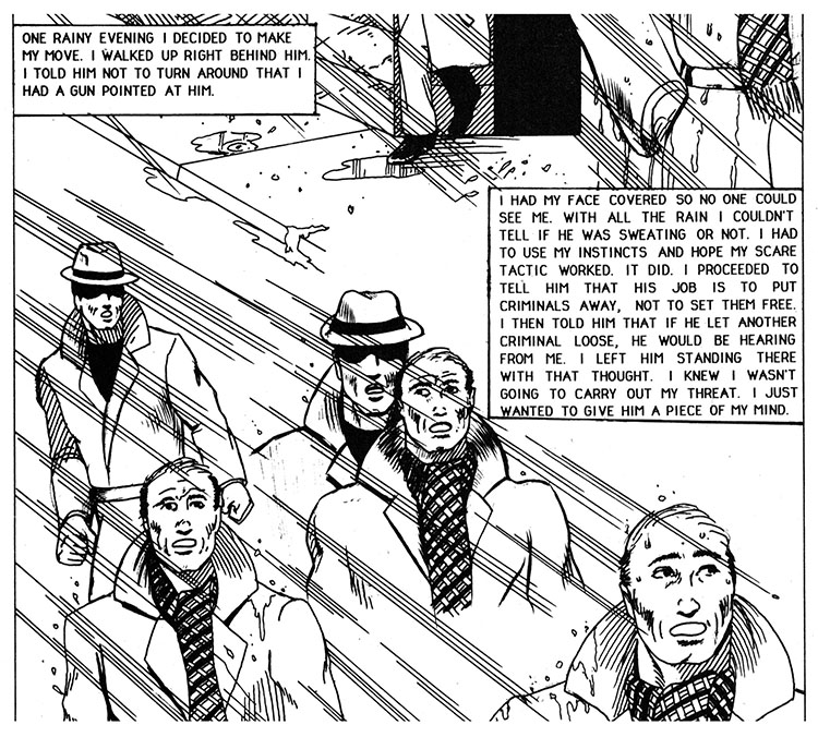 Write a letter? Make a phone call? Take out an ad in the local paper? Appear on one of those public interest announcement segments on the local news? Nope, just watch the guy buy cigarettes for two weeks and then mumble something threatening to him in the rain. Once again crime is defeated - by crime itself!