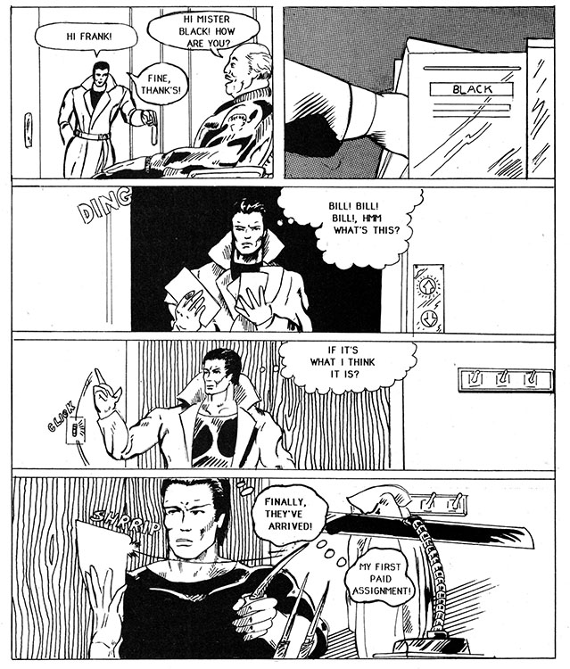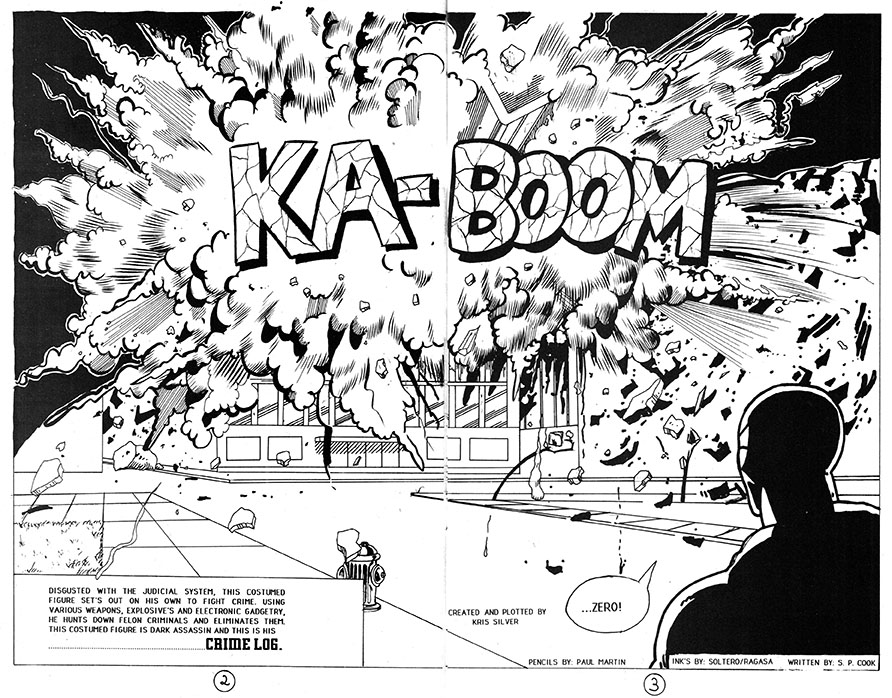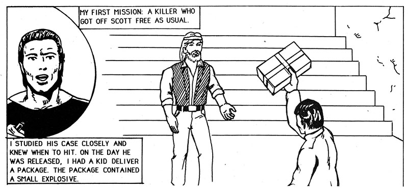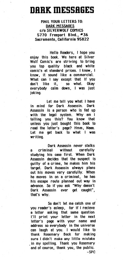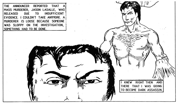 Disgusted with the judicial system and its "laws" and "due processes" and "evidence," this costumed figure set's out on hi's own to commit crime's that in some way also fight crimes, don't try to figure it out. This is the Dark Assassin and this is his CRIME LOG in which he logs all the crimes he avenges, or crimes he himself perpetrates, whichever.