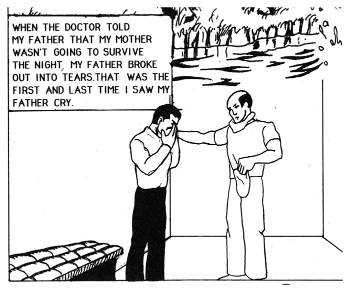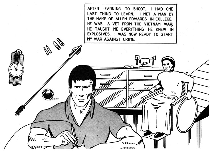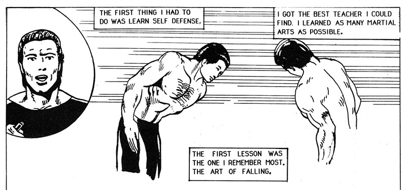 Now to leap into action by... spending years learning self defense! The one he remembers most is falling. I guess he fell a lot. That'll really help him fight crime, he'll just fall down on those criminals.