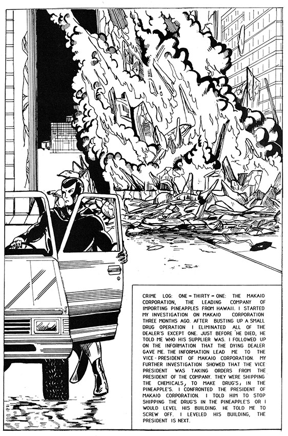 The Dark Assassin murders four or five people in order to learn that the vice president of a company was - get this! - taking orders from the company president. Sure to be shocking news to anyone who has no idea how anything works. And when they didn't stop shipping the chemical's to make drug's in the pineapple's, the Dark Assassin blew up their entire office building and everybody in it, whether they were evil drug lord's or just the custodial staff. Take that, crime!