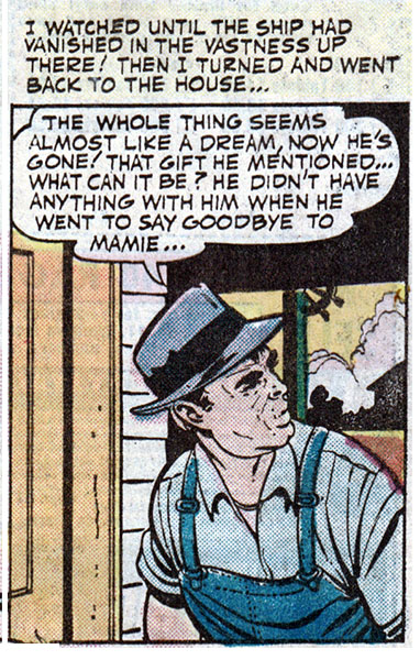 Stopped dead in horror! Shocked beyond all comprehension at what the spaceman had given Mamie! At no point could I have put two and two and two together to come up with the answer to what this alien creature, who might not understand how Earth people say things that aren't meant to be taken literally, could have done to my wife that would be a response to something Mamie was always saying! I guess I'm kind of dim!