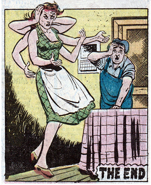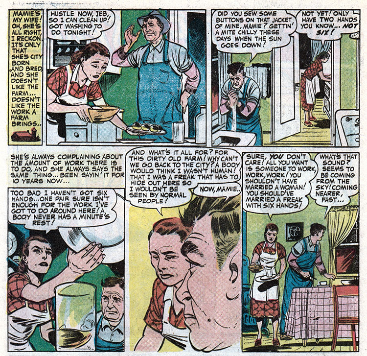 Well, there it is. Six hands. Hope you weren't TOO shocked. Look on the bright side Mamie, if they ever make a movie out of that insane adult novel about the subterranean lesbian S&M spider-woman that Bill Ward did illustrations for (look it up, if you aren't at work), you're locked into the starring role, and will finally get away from that farm!