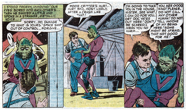 Well, this fella didn't seem to be like any of the space aliens you see in the movies or in the regular newsletter I get from the Aerial Phenomena Research Organization. Maybe this one's not here for our natural resources or our women, maybe he just wants a shave and a hot meal, maybe a couple of bucks if I can spare it.