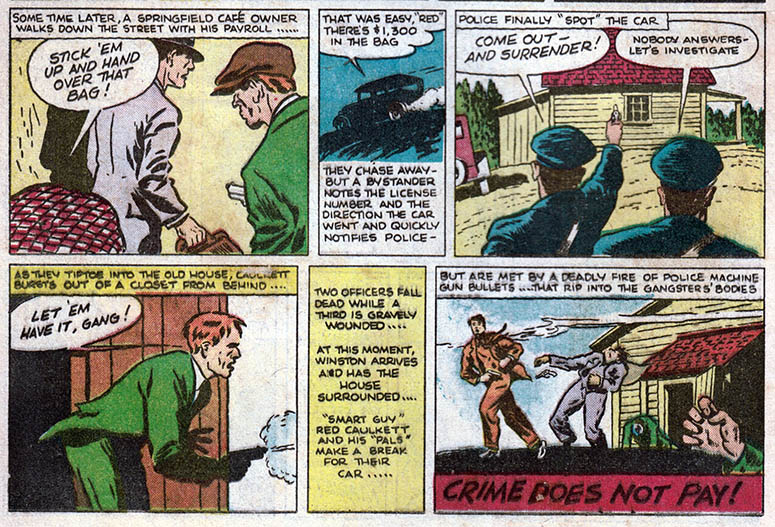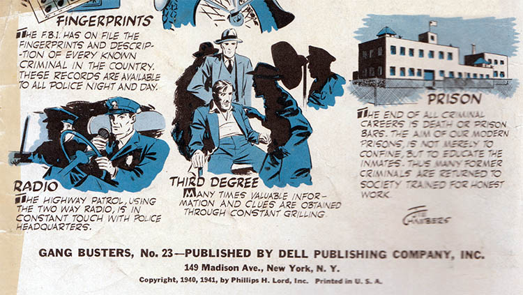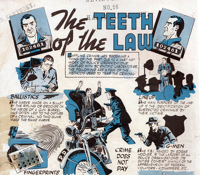 Beware, criminals, for your baffling crimes are soon to be eliminated entirely due to the vast network of cops and cop-adjacent organizations now using science in their war on whatever funny business you're up to. These scientific methods include Ballistics, Fingerprints, Lineups, G-Men, and constantly reminding everyone Crime Does Not Pay. Which is why crime is now, of course, a thing of the past.