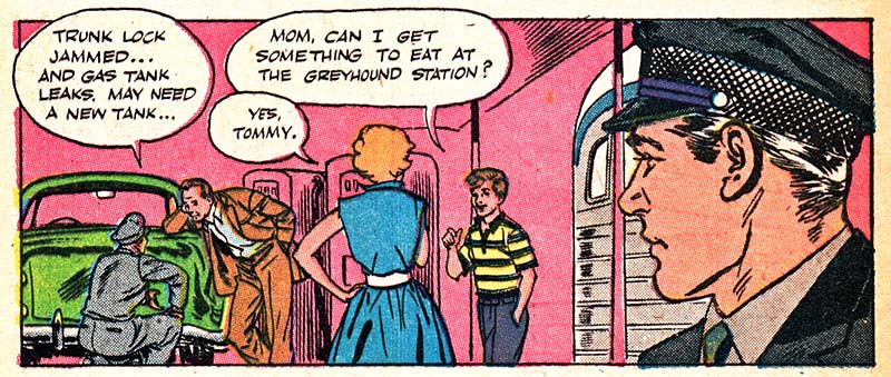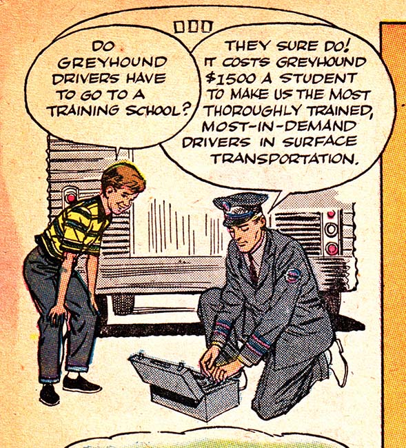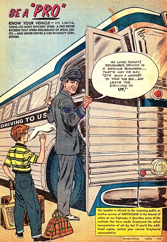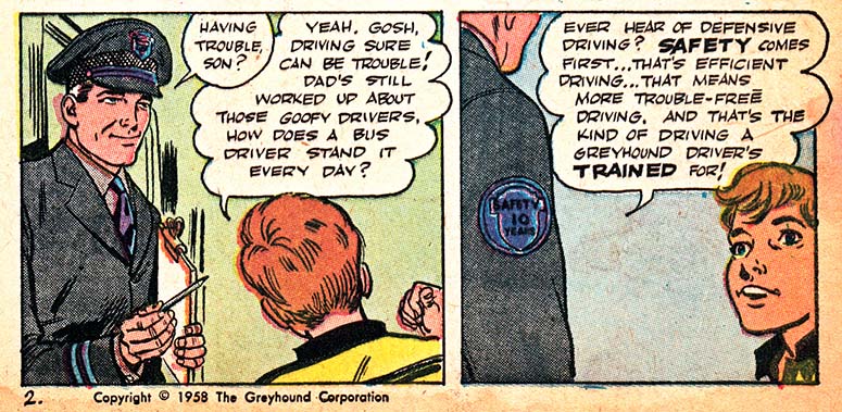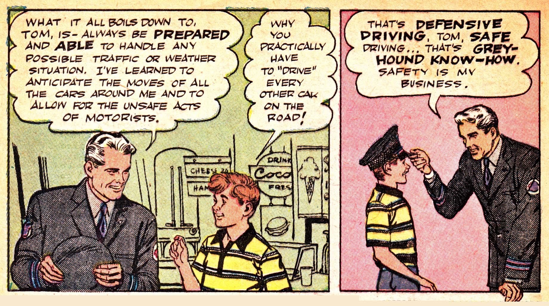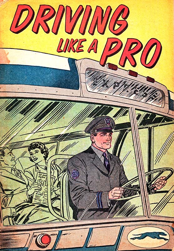 That's the purpose behind "Driving Like A Pro," this educational comic published by Greyhound Bus Lines to not only try to stem the tide of terrible drivers wreaking Signal 30-type havoc on America's roadways, but also to try and educate these potential disasters as to how they could avoid bad driving habits and drive like professionals. First step is to get a snappy hat and straighten that tie!