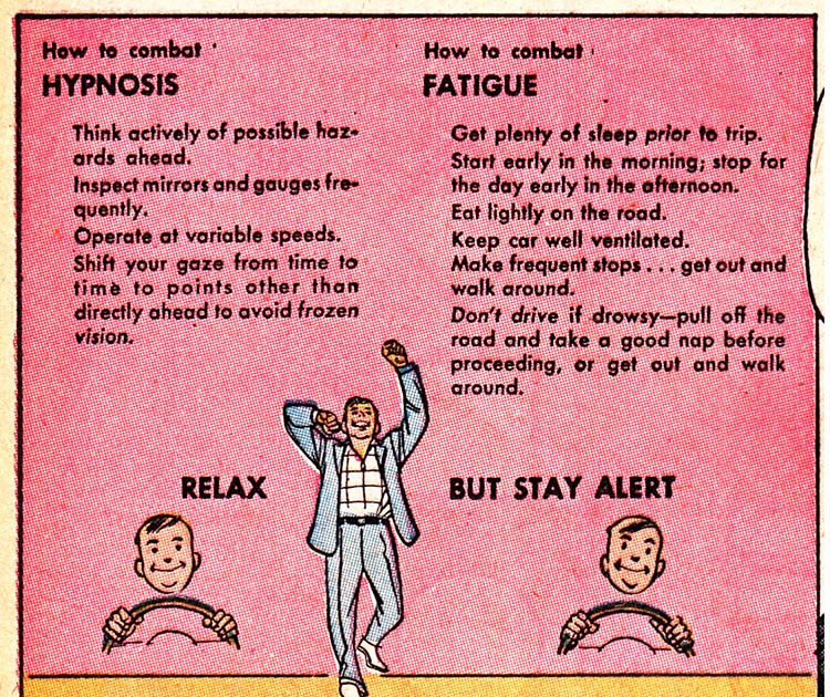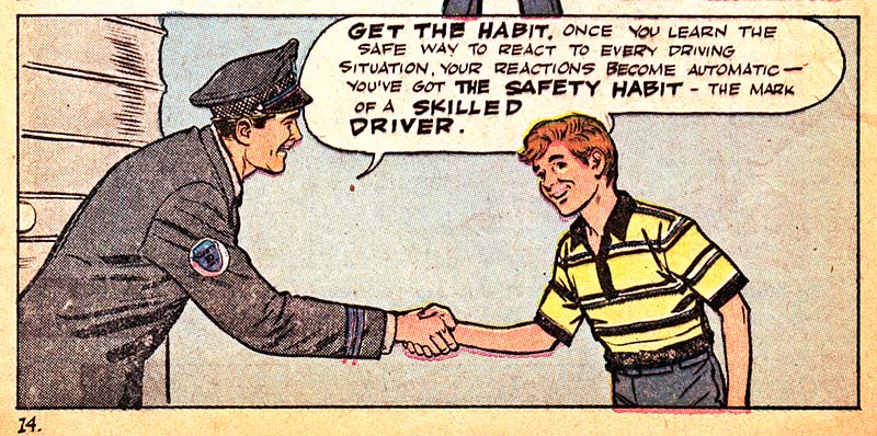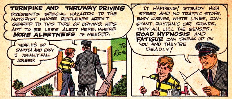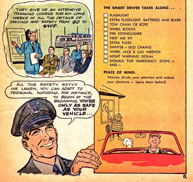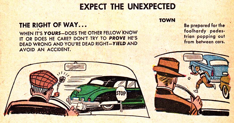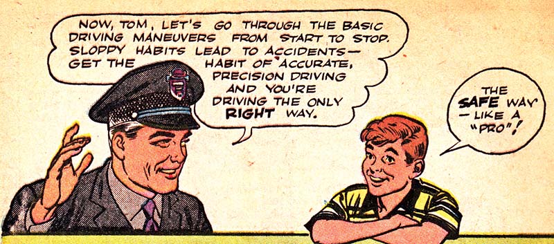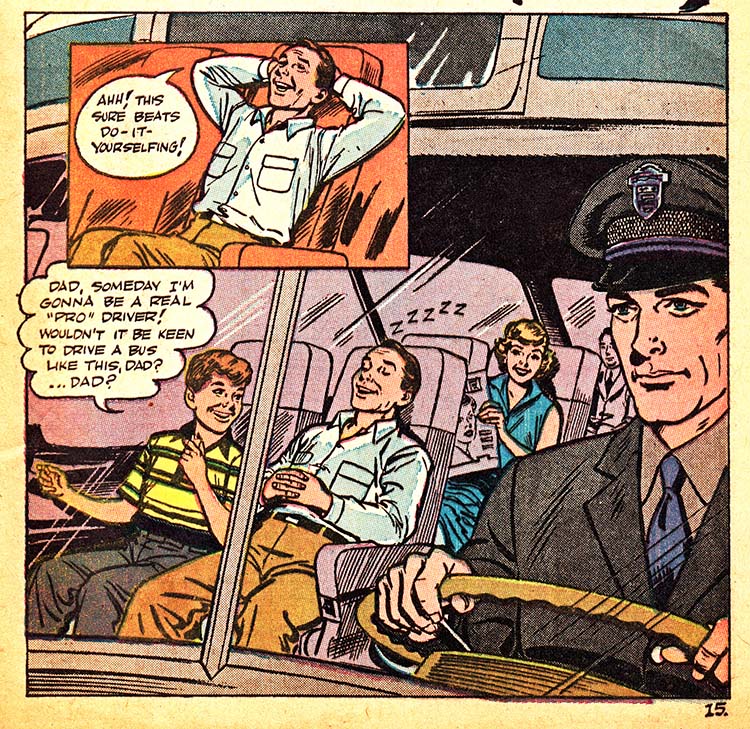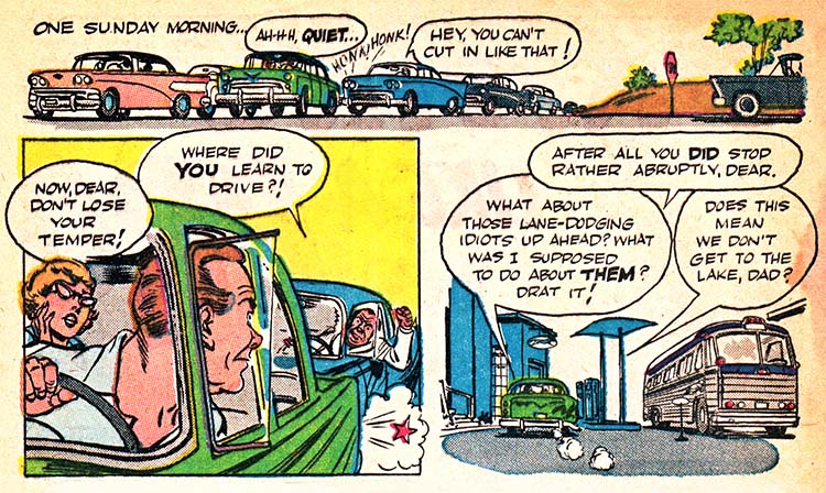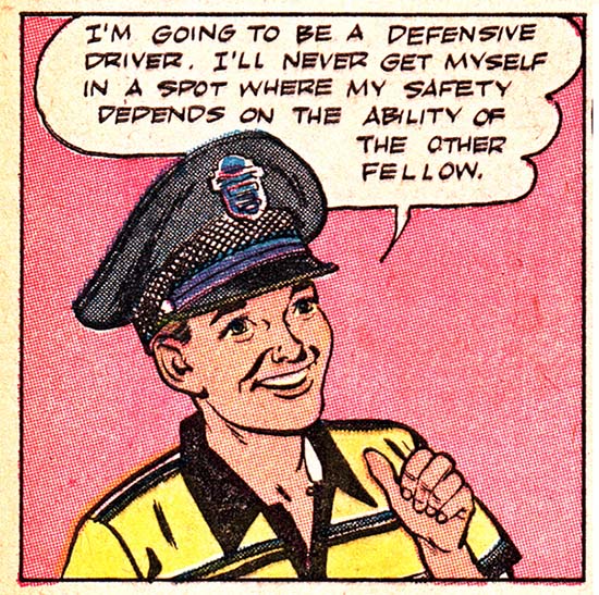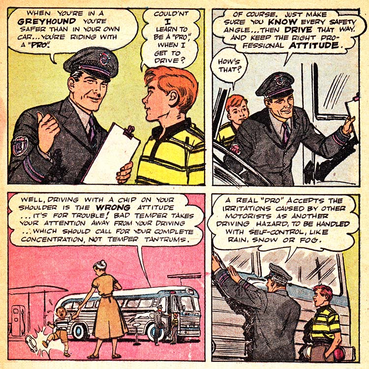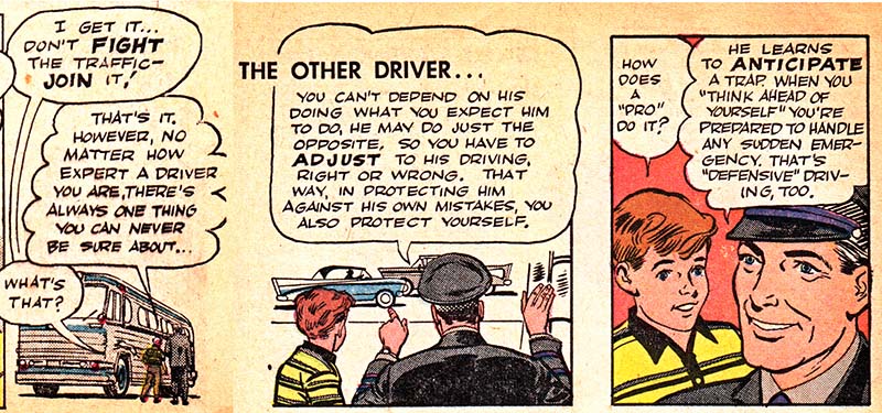 The menace of the automobile has been with us for more than a century now, and while we constantly tell each other that drivers are getting worse all the time, the fact is they've always been bad. Why, they were so terrible in the '50s that bus companies published entire comic books devoted to reminding everyone how terrible these amateur auto jockeys were.
