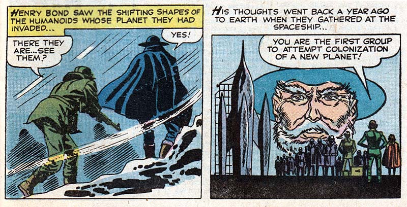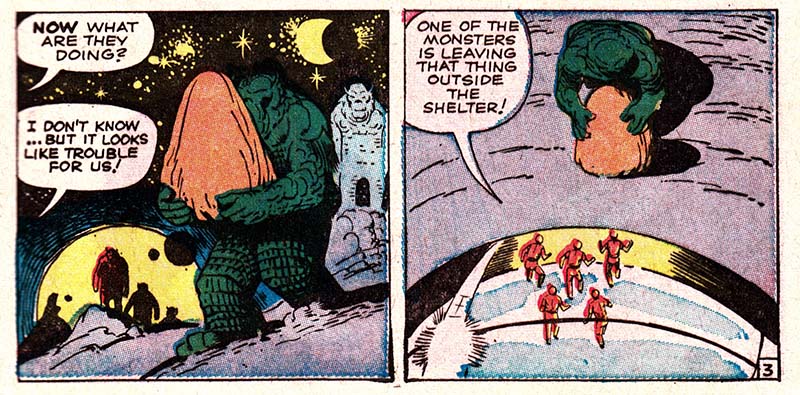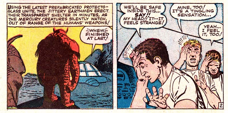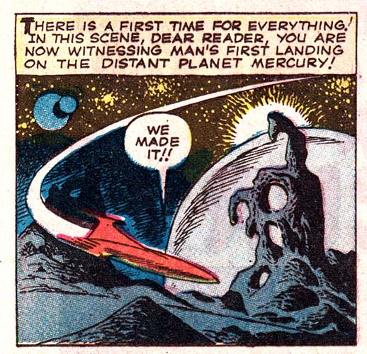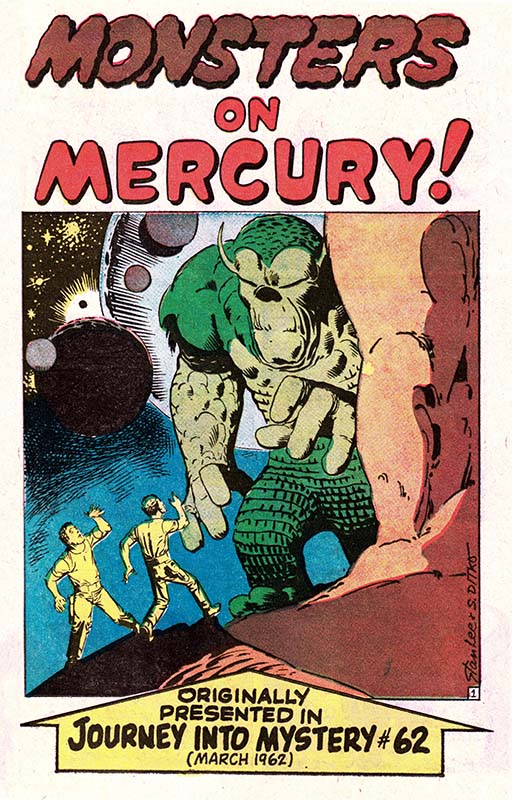 The sharp eyed reader will notice that this is not the original printing of "Monsters On Mercury," but a reprint from a 1966 issue of "Fantasy Masterpieces." The even more sharply envisioned reader will be amazed at the chutzpah of a Marvel Comics willing to recycle stories barely four years old. And our readers posessed of amazingly perceptive powers of observation will already know that "Monsters On Mercury" didn't actually appear in Journey Into Mystery #62, but rather issue #78, proving that not only was 60s Marvel already cannibalizing itself, but that it didn't even know where it was cannibalizing itself from. Wake up, Stan!