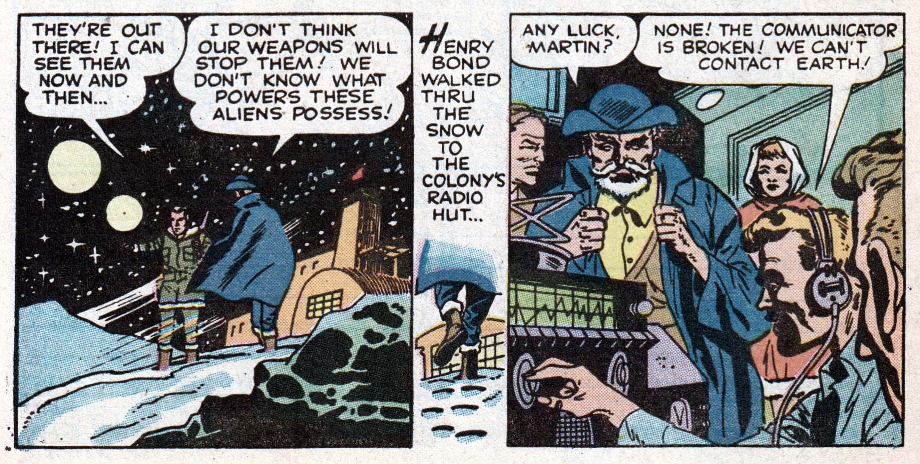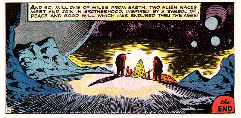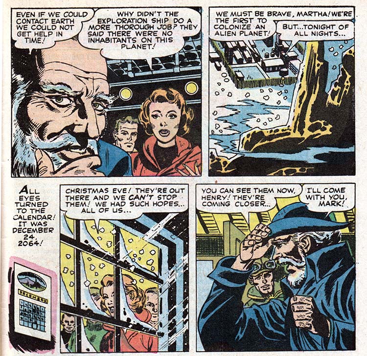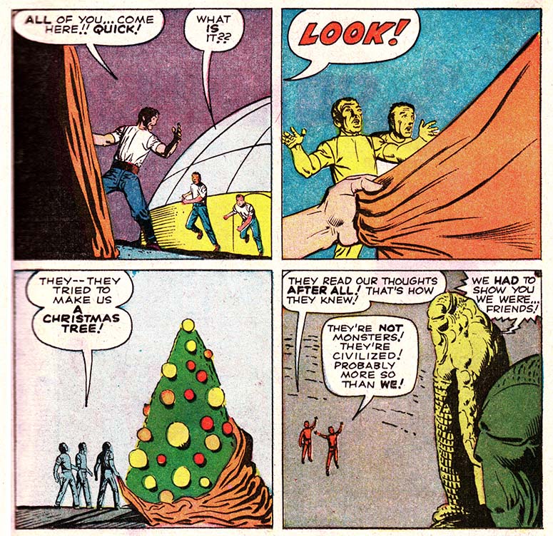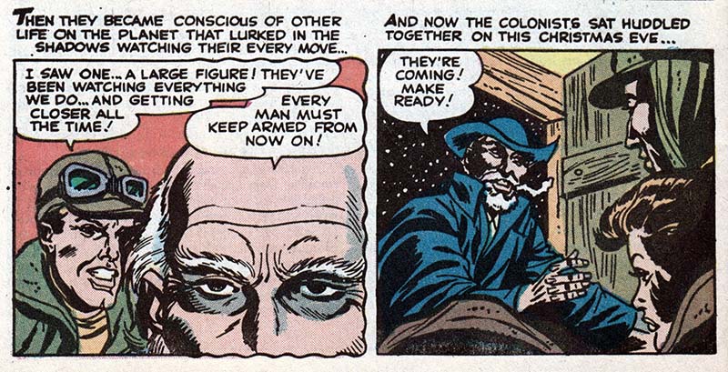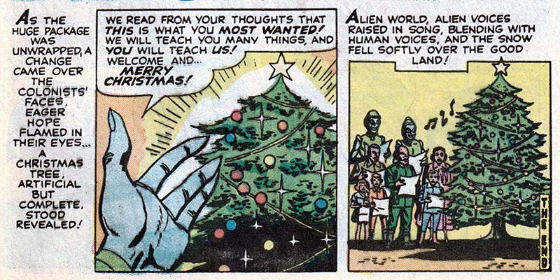 It was all peace and brotherhood until one of the aliens asked "So... what did you bring us?" And then it became the worst nightmare imaginable, the nightmare of going to a Christmas thing and it was a gift thing and you didn't know so you're the only one there without a gift and you really feel like a dope, and then somebody hands YOU a gift and then you feel even worse. In fact I'd have to say the only thing worse than a story about spending Christmas on a far off planet with alien beings, is TWO stories about spending Christmas on a far off planet with alien beings! Of course we're kidding. There can't be more than one of these lame attempts to mix holiday cheer and space monsters, right? Right?